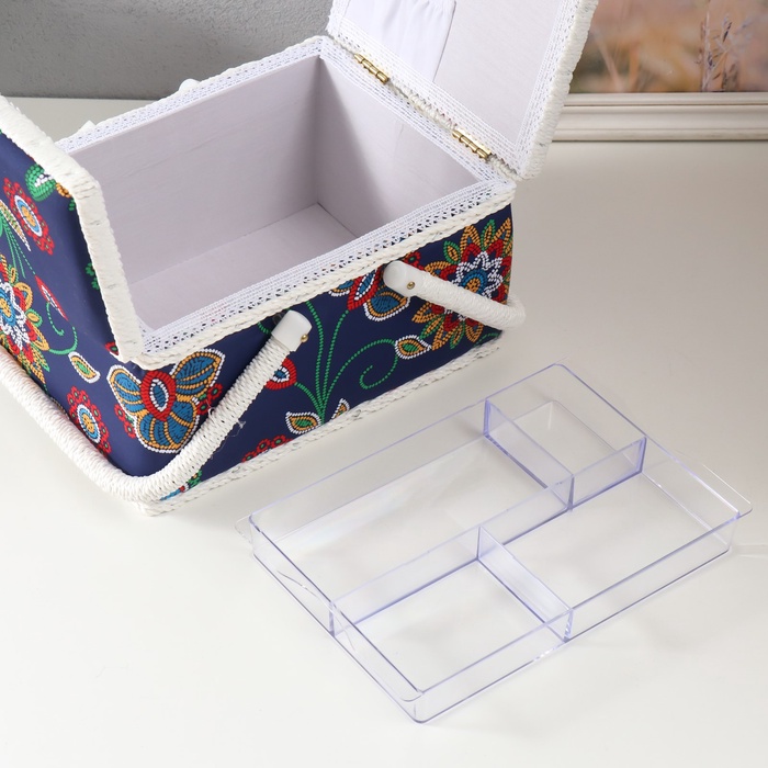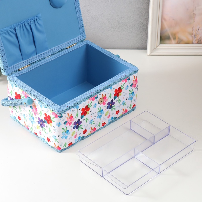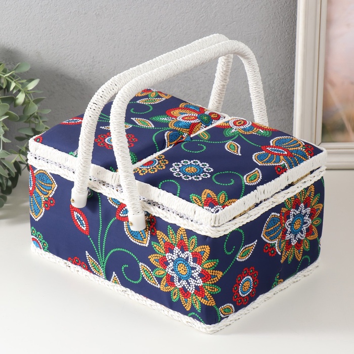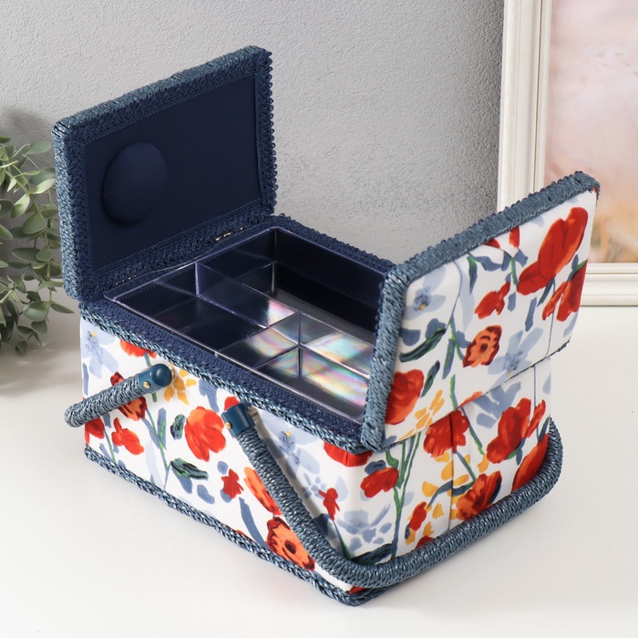 Шкатулка для рукоделия и шитья «Нарисованные цветы на синем», хранение ниток, иголок, мелочи, 19×26×14.5 см 5 фото