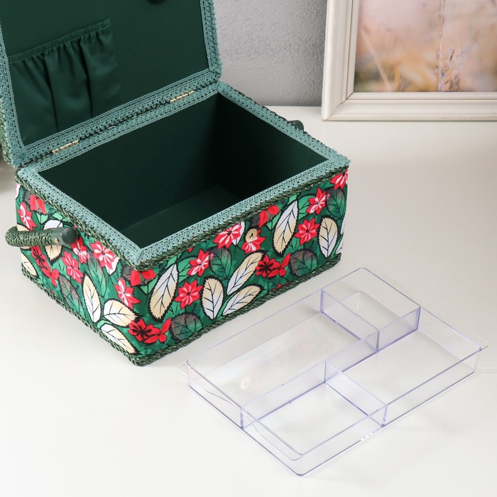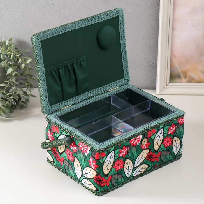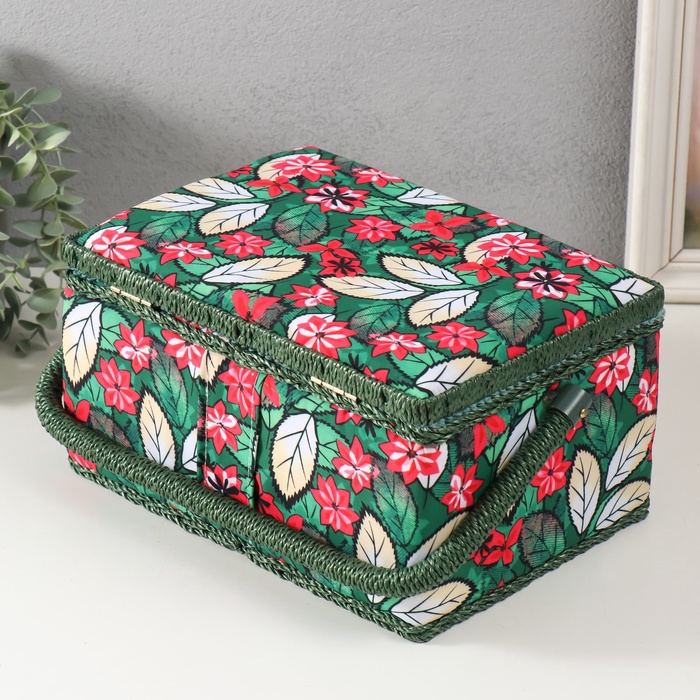 Шкатулка для рукоделия и шитья «Пуансеттия на зелёном», хранение ниток, иголок, мелочи, 19×26×14.5 см 7 фото