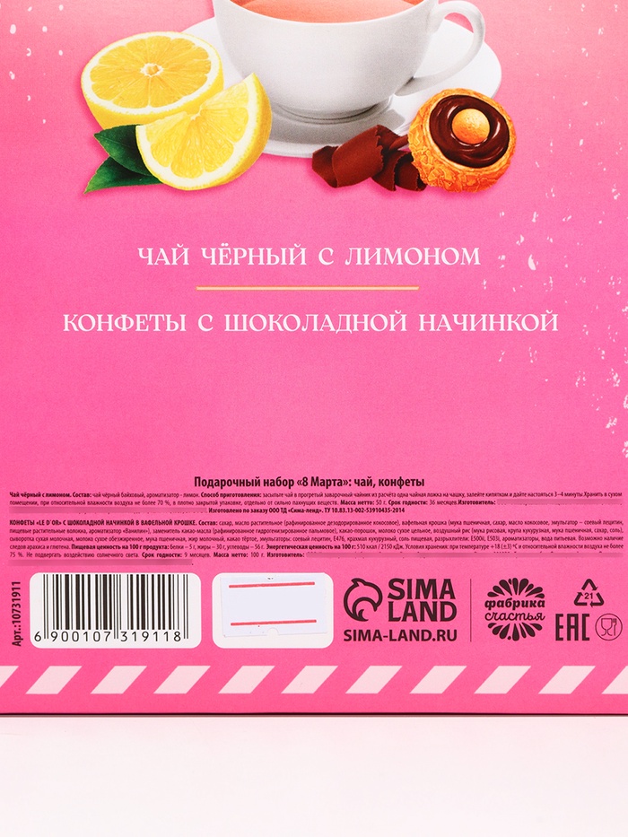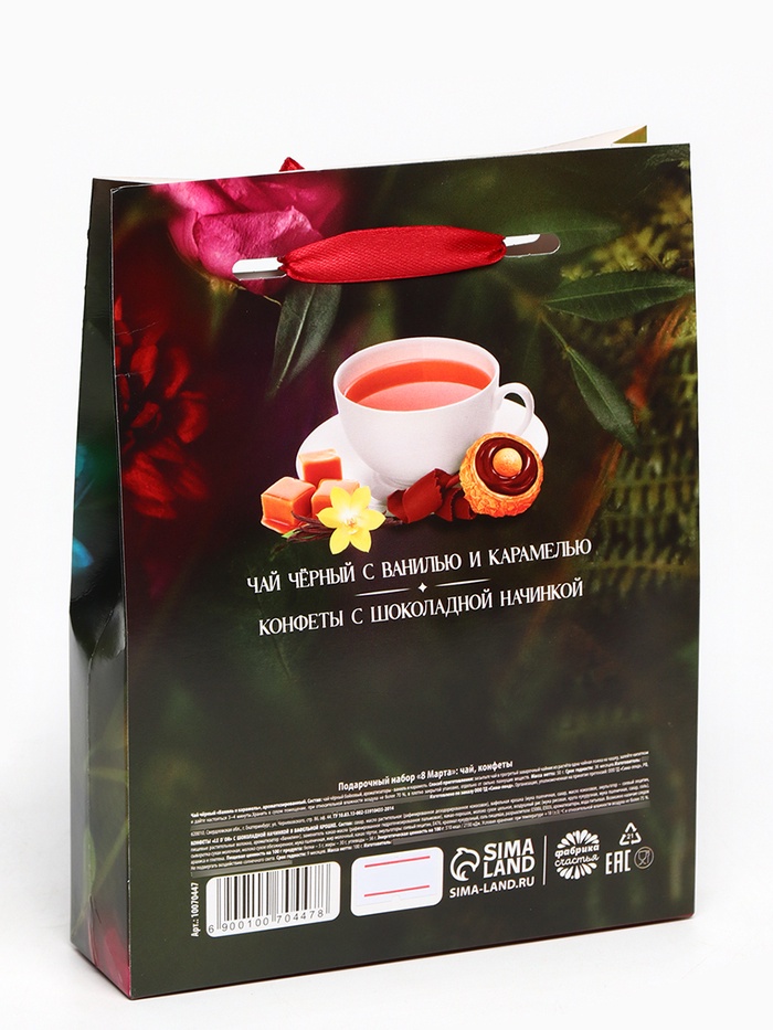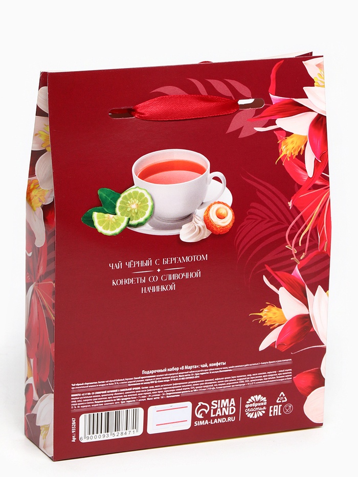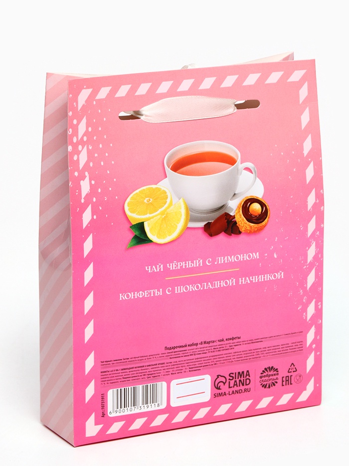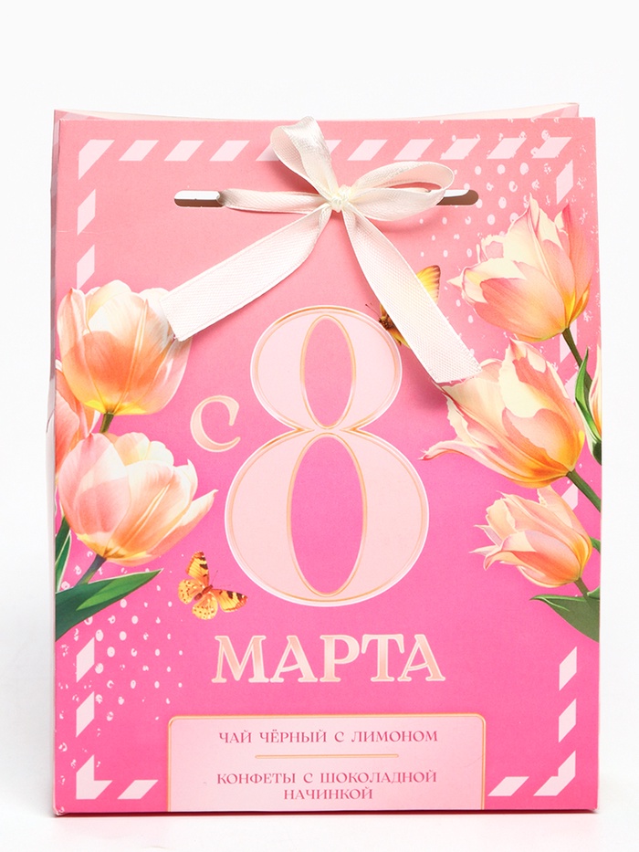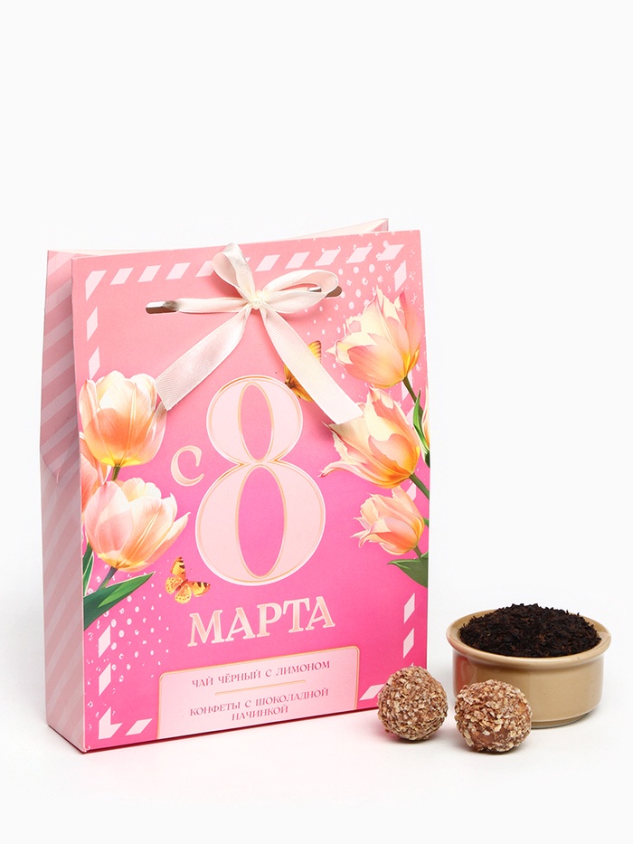 Подарочный набор «С 8 Марта» чай черный с лимоном и конфеты в коробке-пакете 7 фото