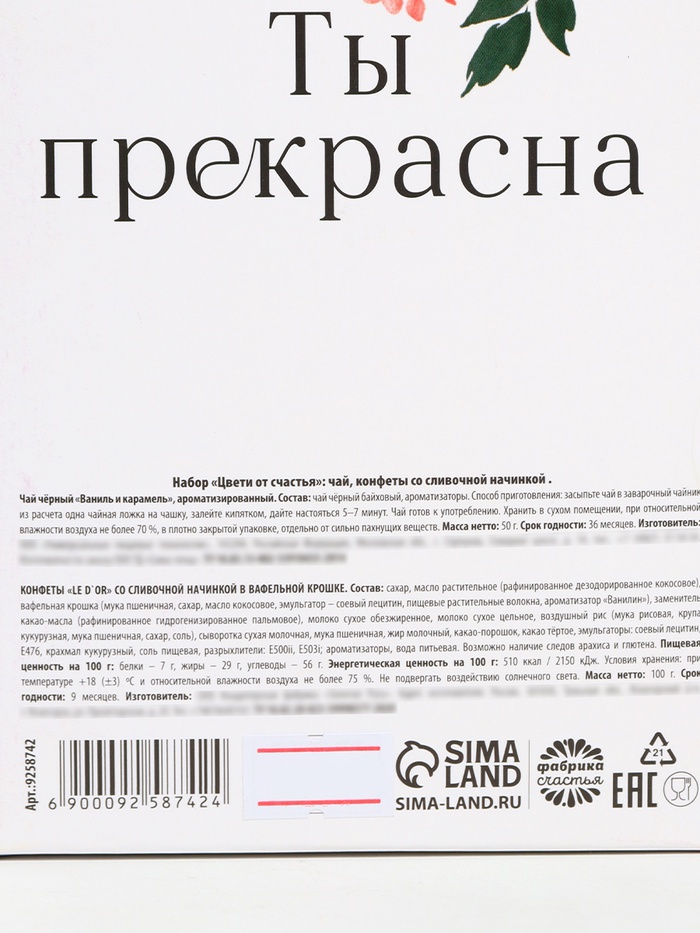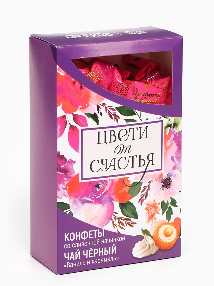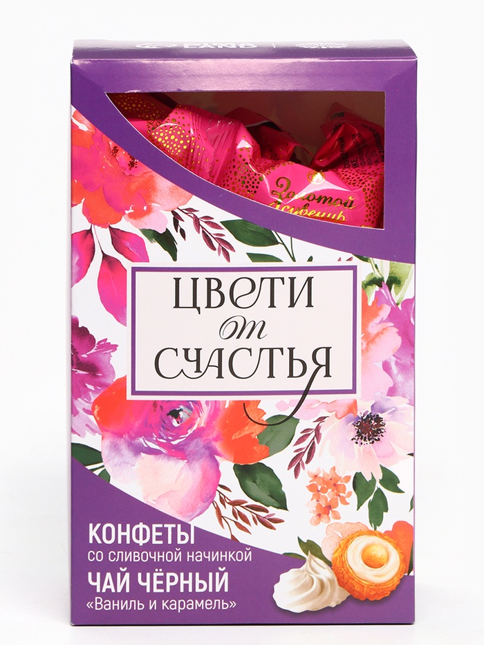Подарочный набор «Цвети от счастья»: чай чёрный со вкусом ваниль и карамель 50 г., конфеты со сливочной начинкой 150 г. 8 фото