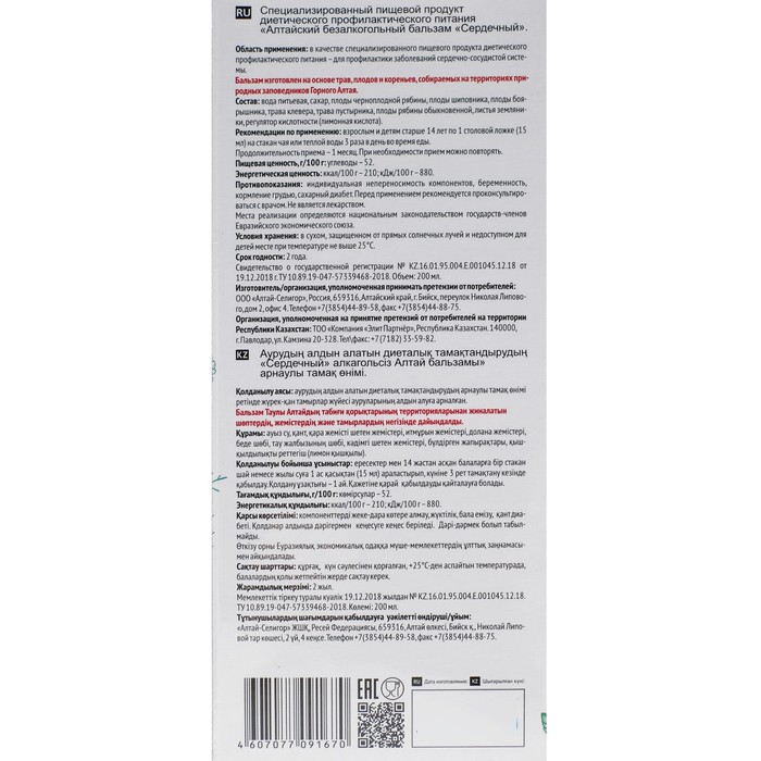 Безалкогольный алтайский бальзам на травах Altay Seligor, сердечный, 200 мл 2 фото