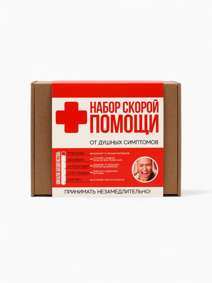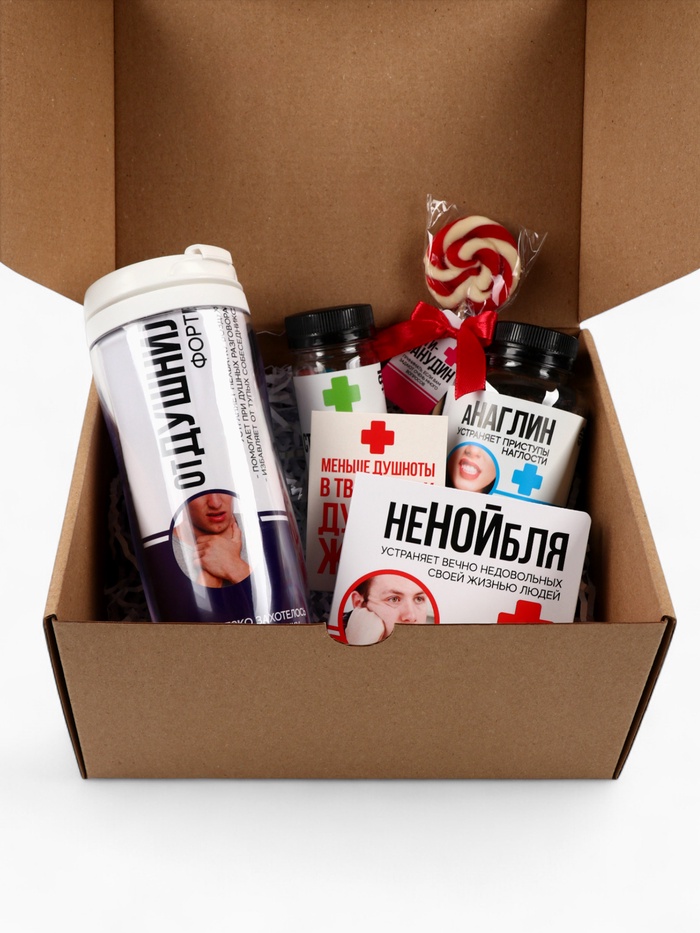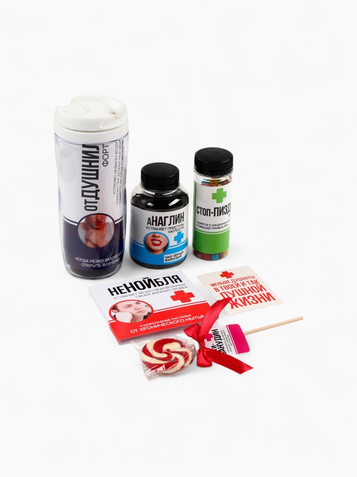 Подарочный набор гифтбокс «Аптечка»: чай, драже, шоколад, термостакан, леденец 10 фото