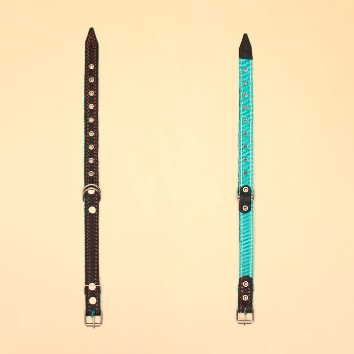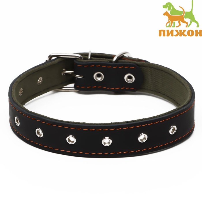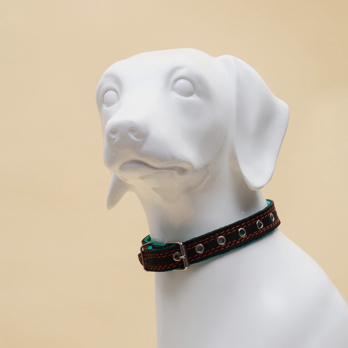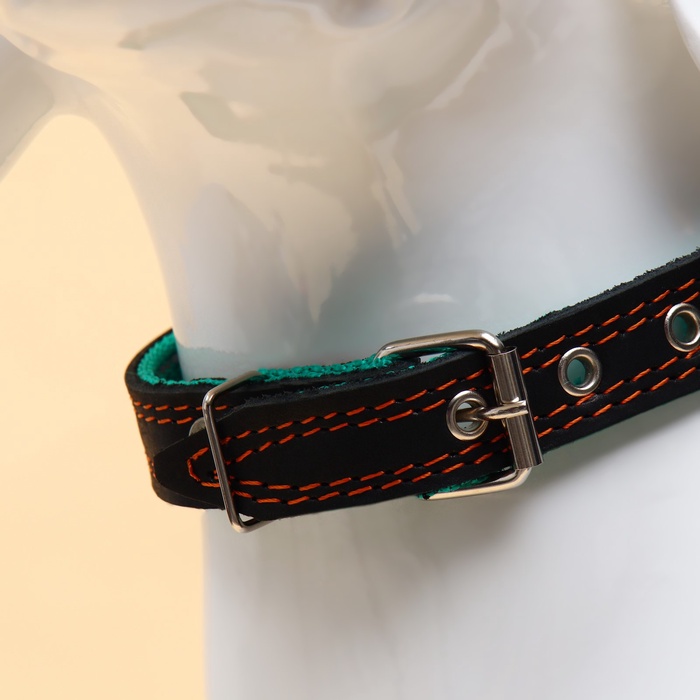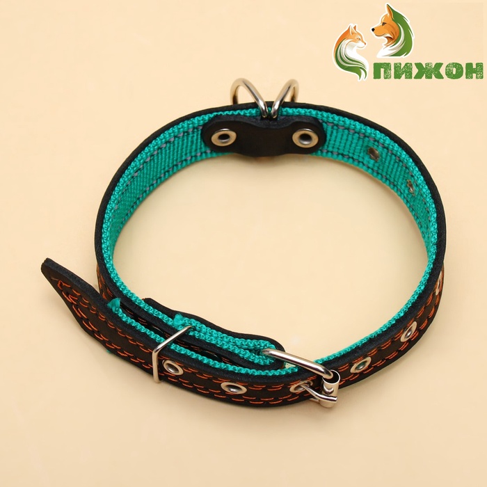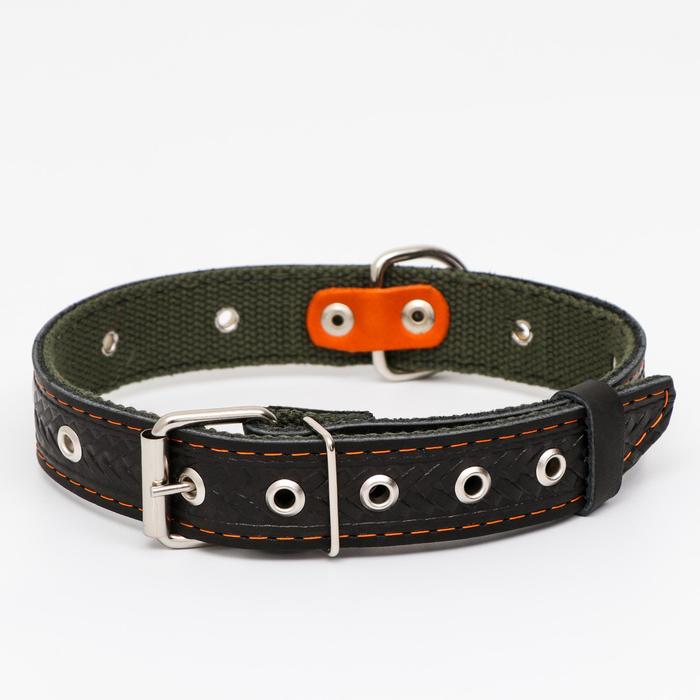 Ошейник комбинированный безразмерный, кожа/брезент, 60×3 см, ОШ 30-57 см, чёрный/зелёный 4 фото