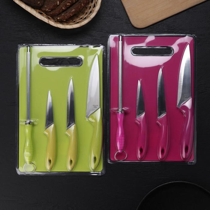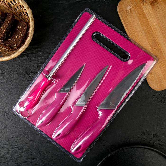 Набор кухонных принадлежностей, 5 предметов: ножи 9 см, 12 см, 15 см, мусат, доска, МИКС 3 фото