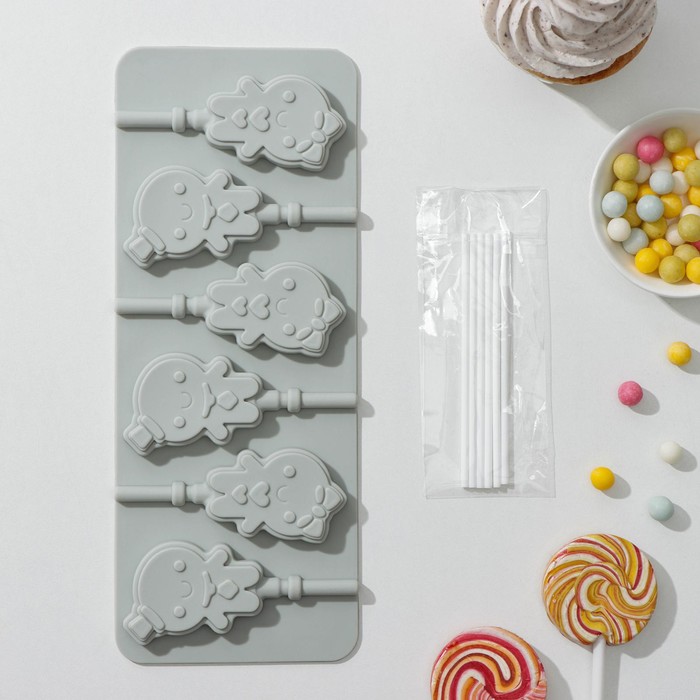 Форма для леденцов Доляна «Детство», силикон, 24×9.5 см, 6 ячеек (5×4.6), с палочками, коричневая