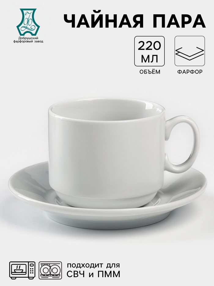 Чайная пара Добрушский завод «Бельё», 2 предмета: чашка 220 мл, блюдце d=13.8 см, фарфор, белая