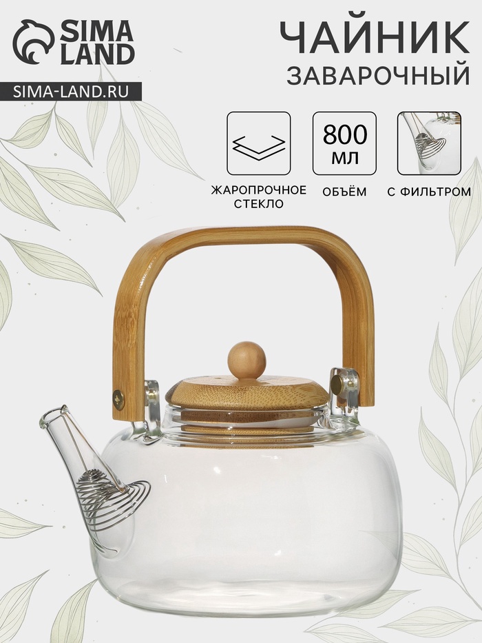 Заварочный чайник «Эко. Бабл», 800 мл, 18×13.5×12.5 см, с бамбуковой крышкой, металлический фильтр, стекло, прозрачный 9 фото