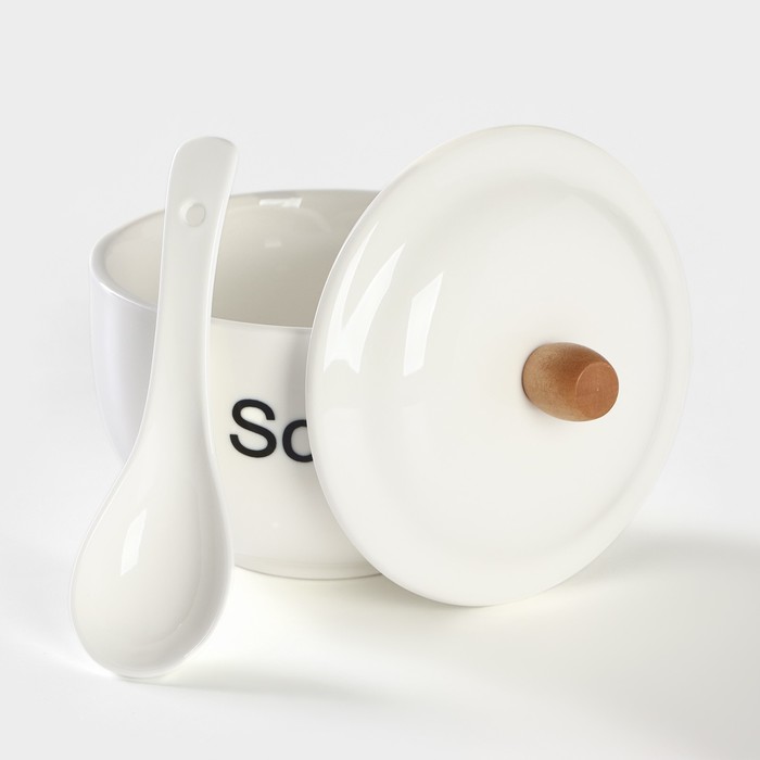 Супница BellaTenero, 450 мл, 15×11.5×7.5 см, с ложкой, на бамбуковой подставке, фарфор, белая 10 фото