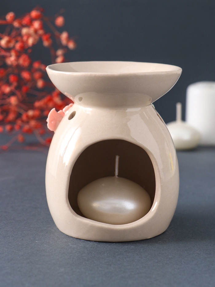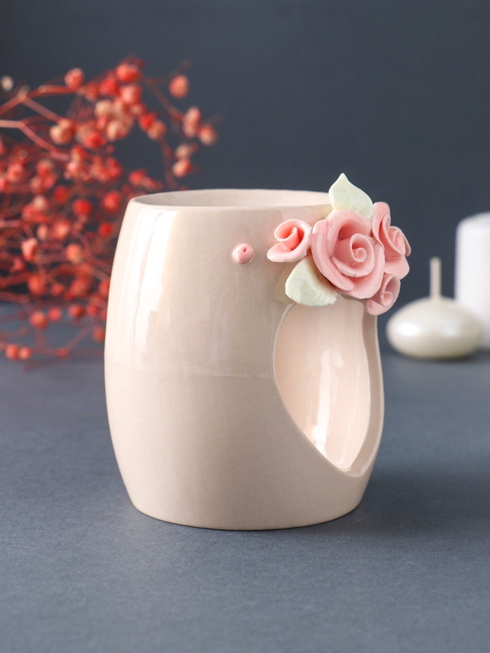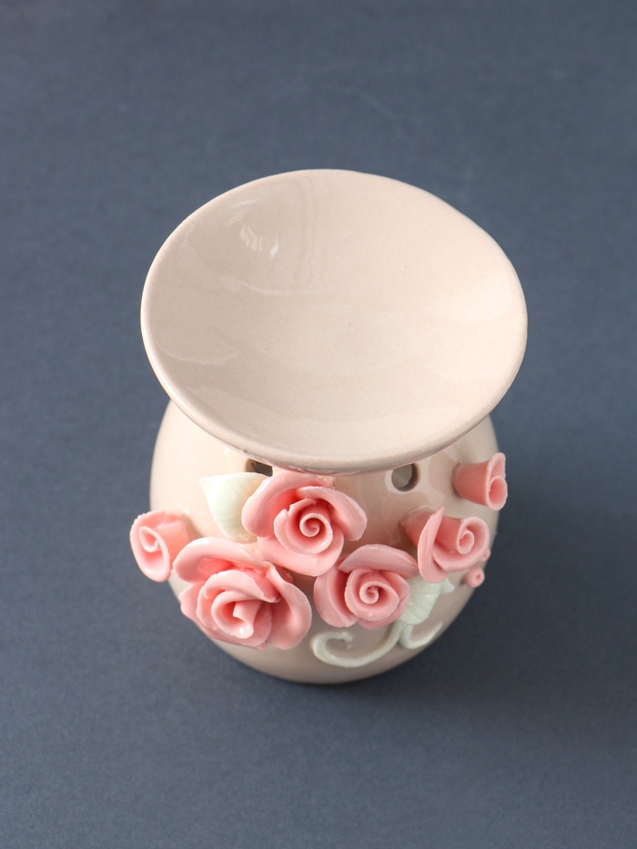 Аромалампа для эфирных масел «Розовые розы с листиками», керамика, бежевая, 7.5×7.5×9 см 9 фото