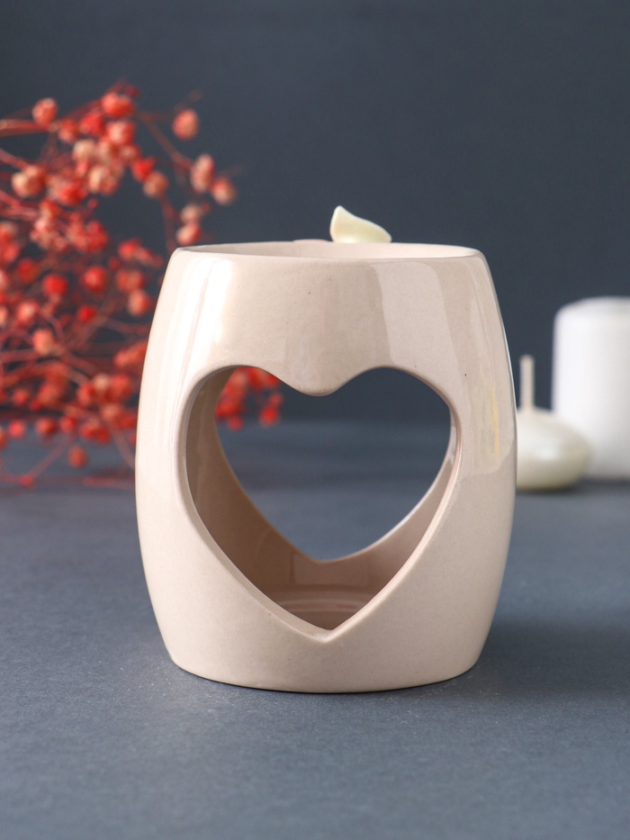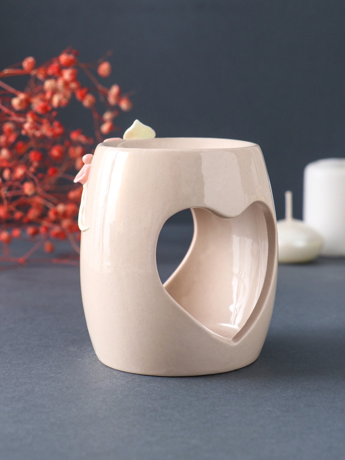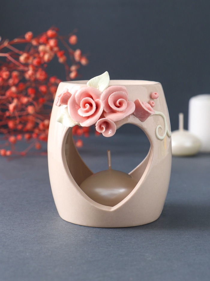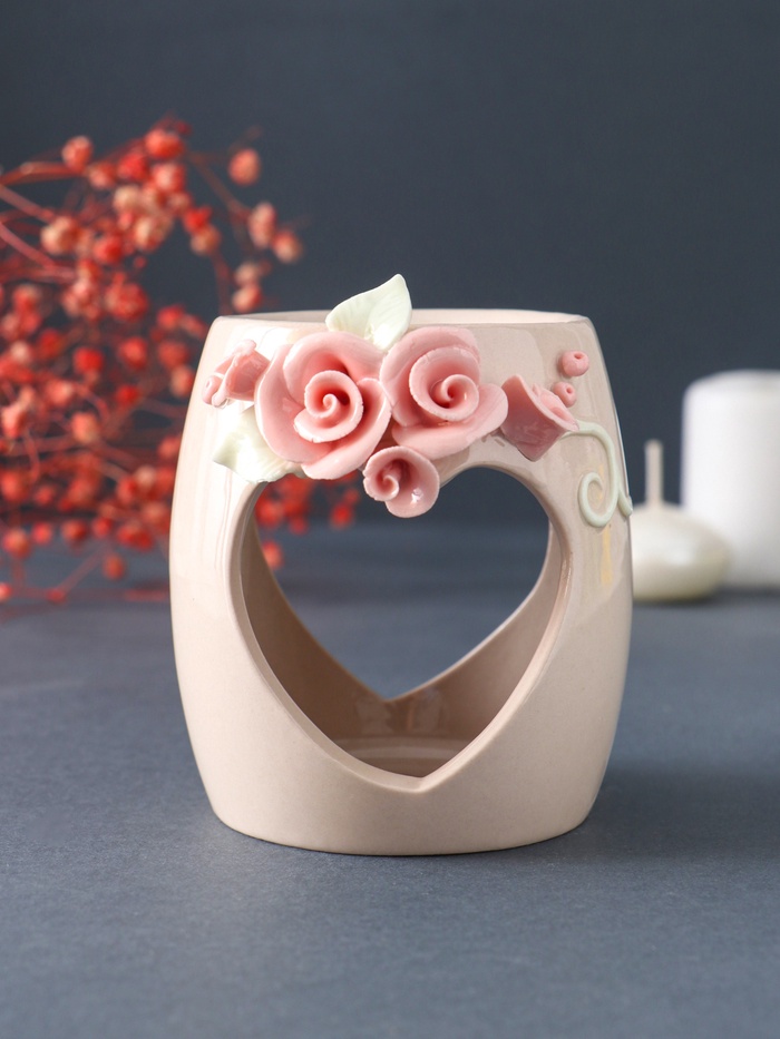 Аромалампа для эфирных масел «Сердце с розами», керамика, бежевая, 8×8×9 см 6 фото
