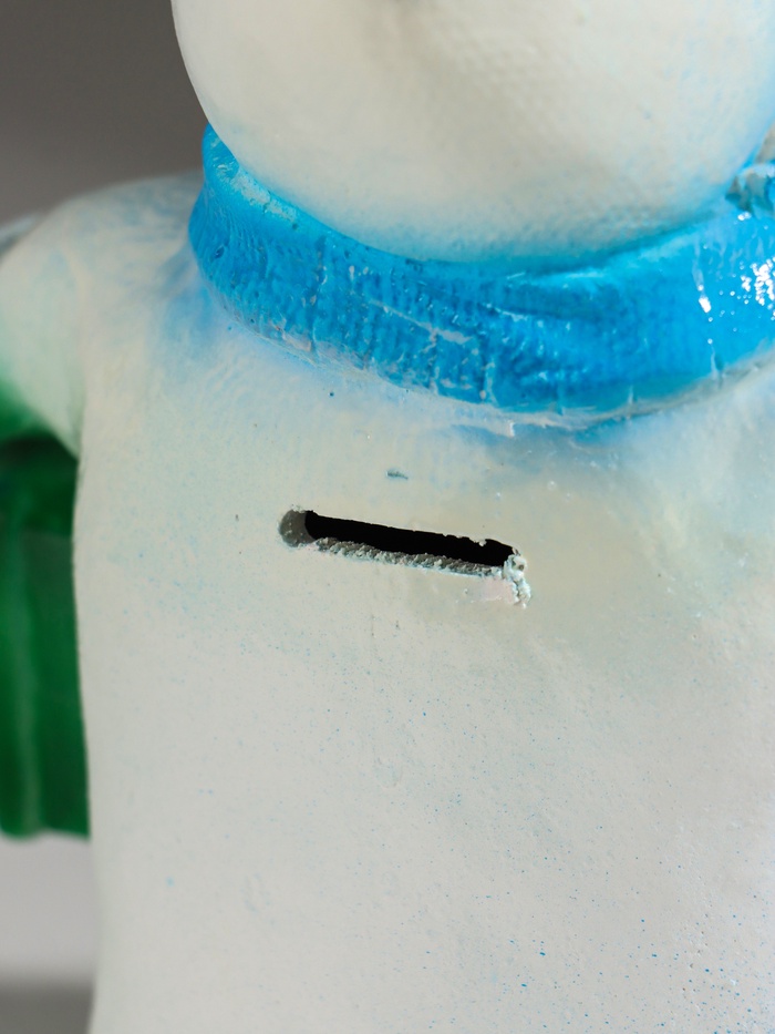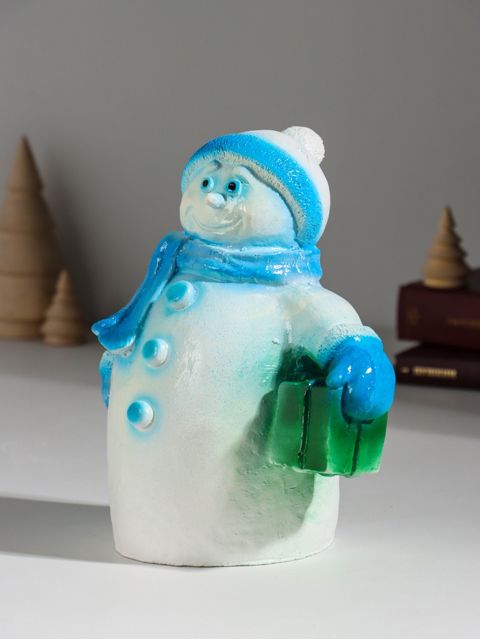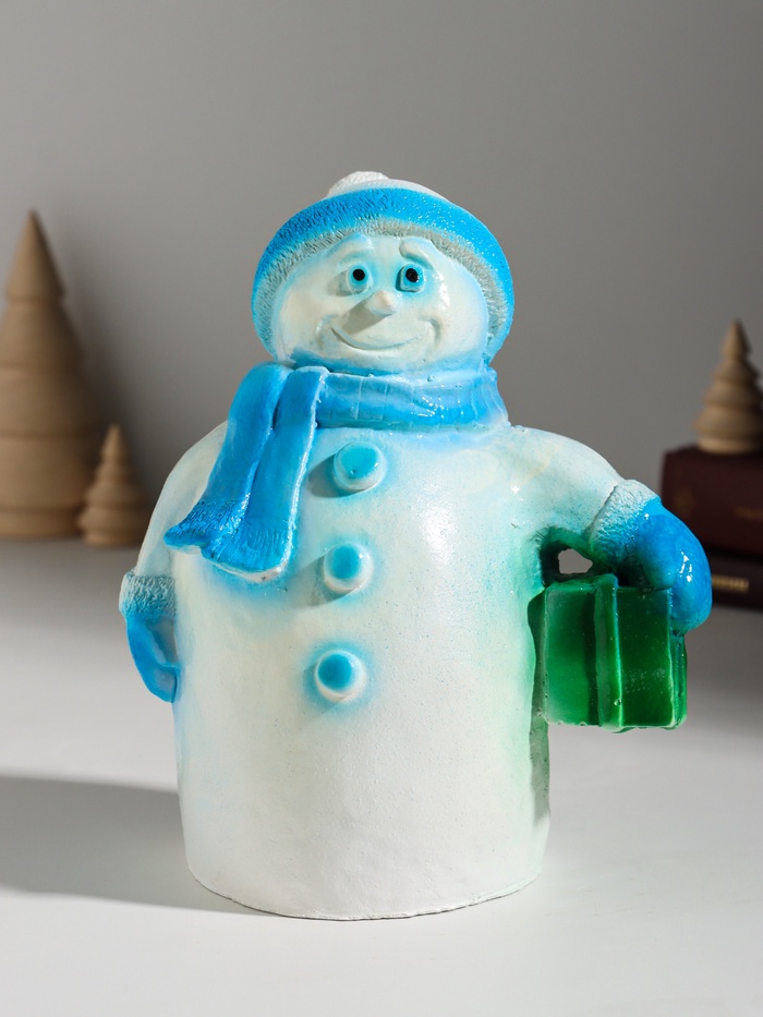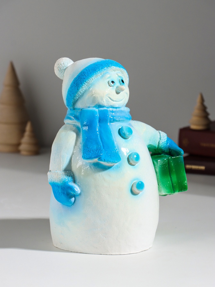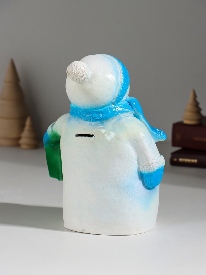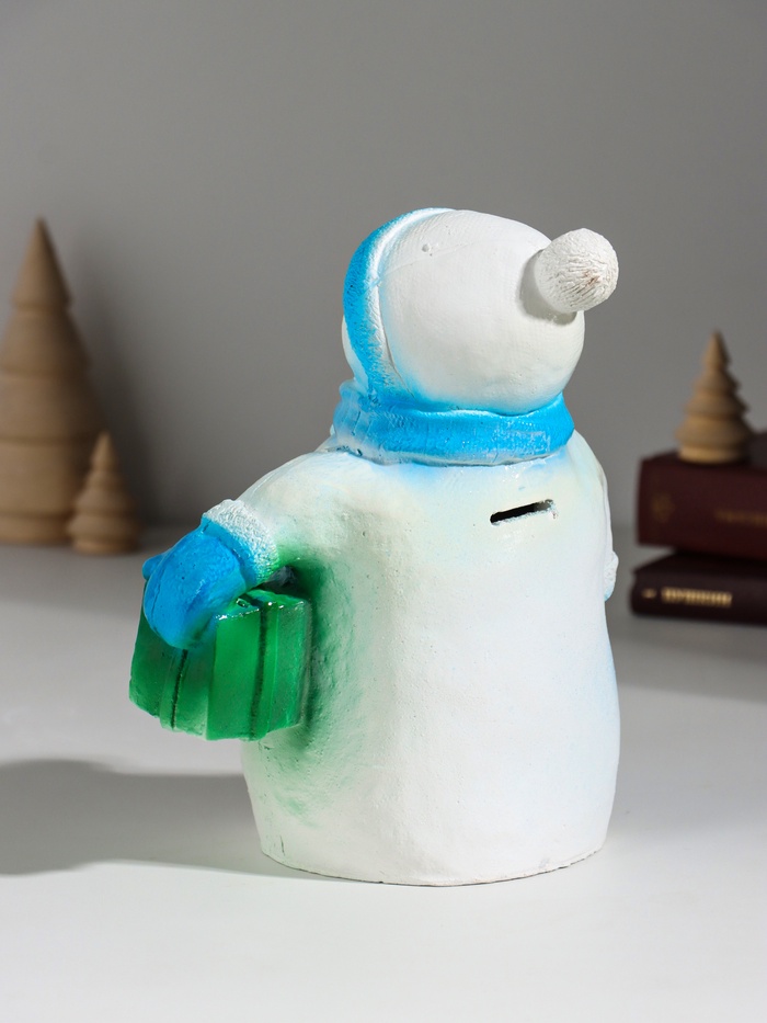 Копилка для денег «Снеговик новогодний с подарком», гипс, 19 см, голубой 6 фото