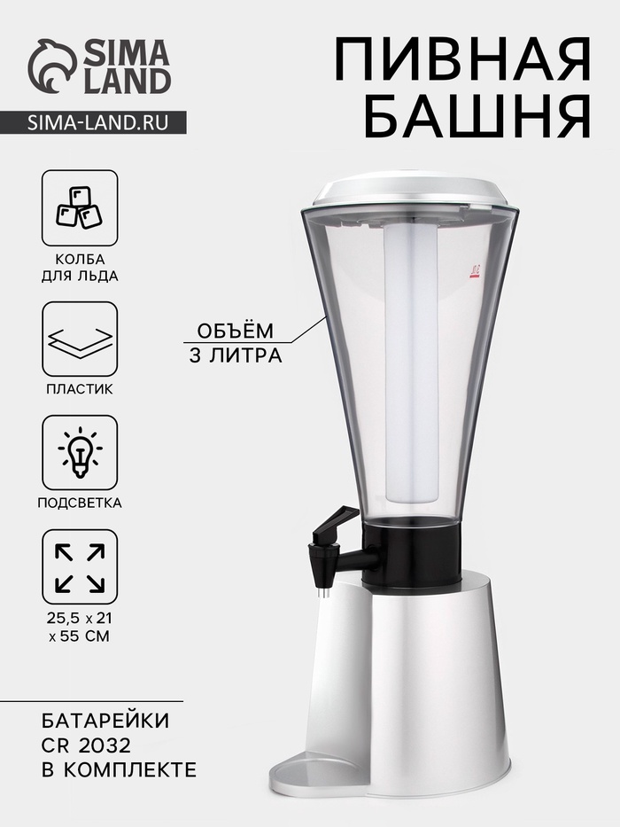 Башня пивная «Петронас», 3 л, колба для льда, с подсветкой, 2 батарейки AG3, пластик, металлик 10 фото