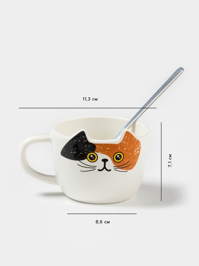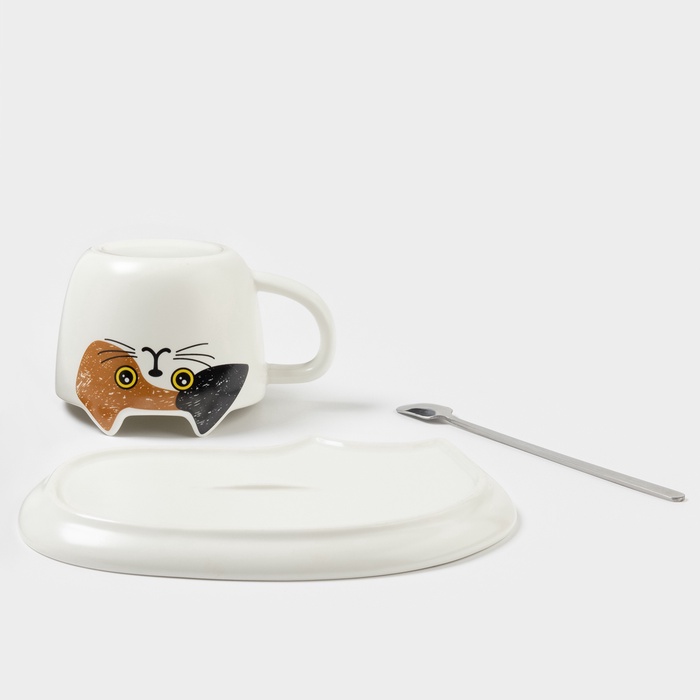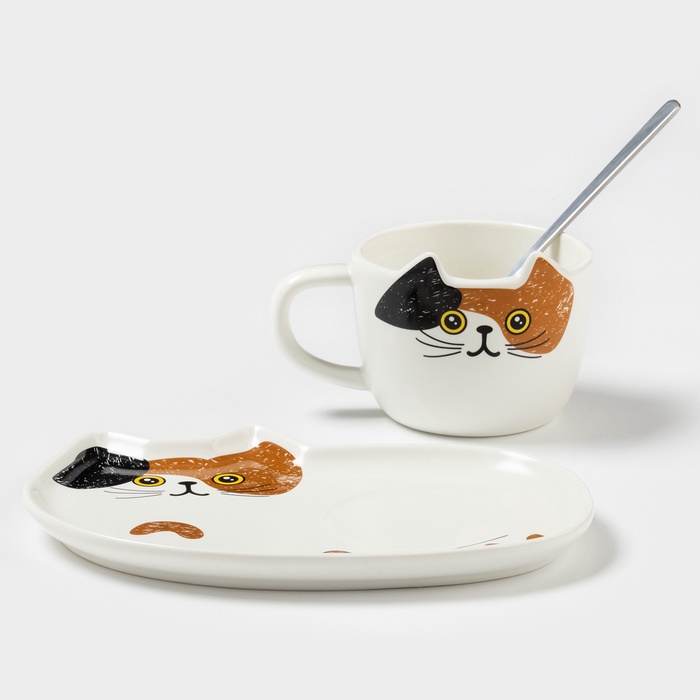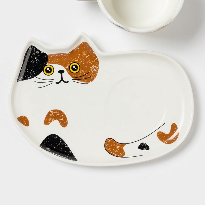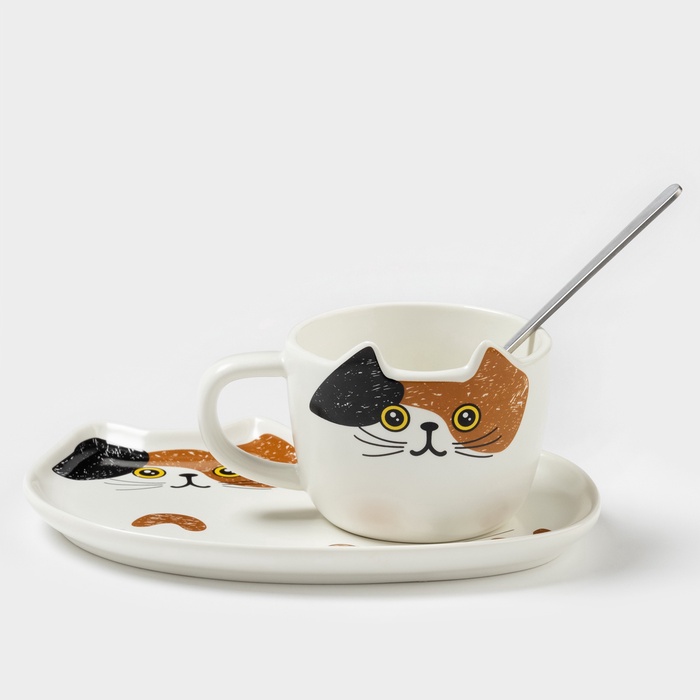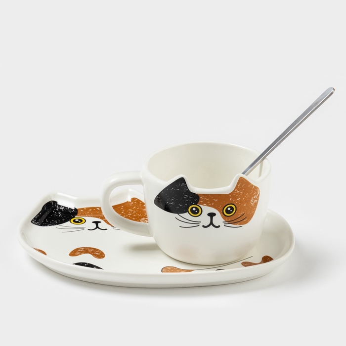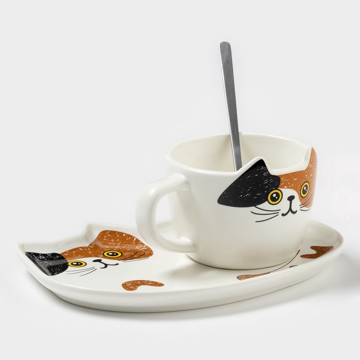 Чайная пара «Котик», 3 предмета: чашка 200 мл, блюдце 18.8×13.6 см, ложка, керамика, белая 10 фото