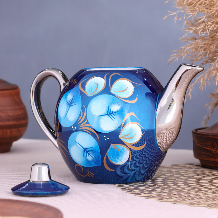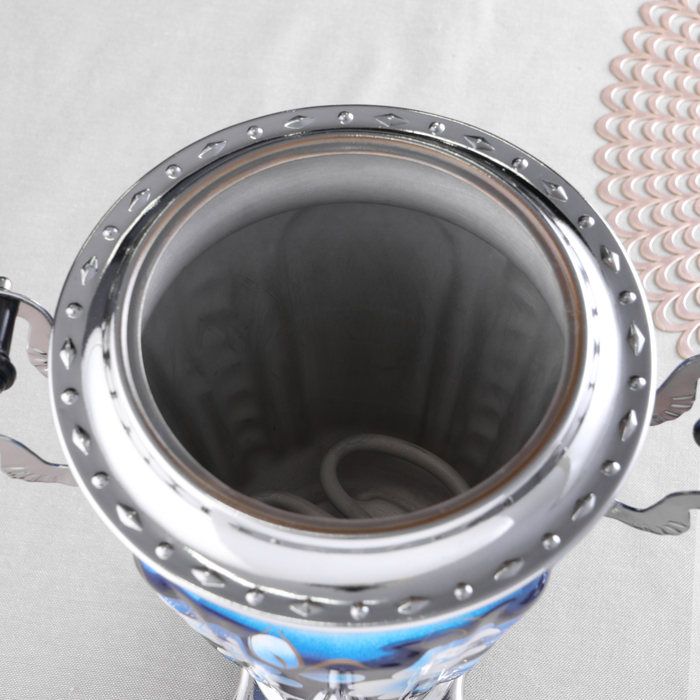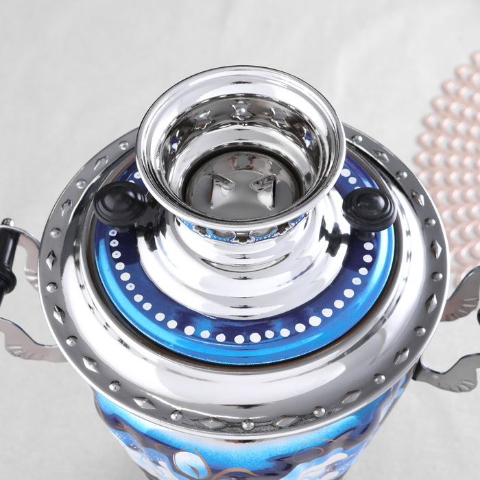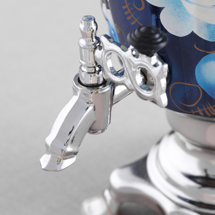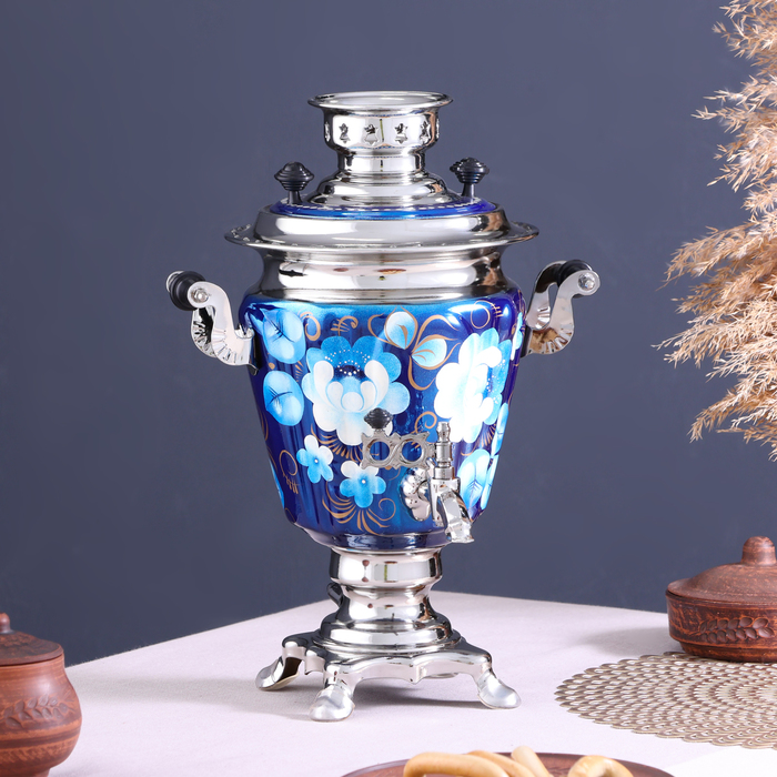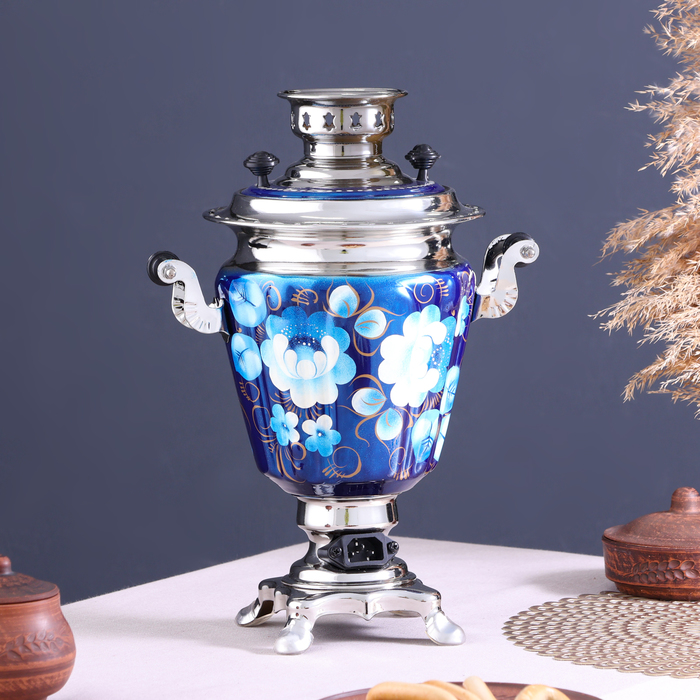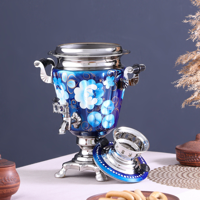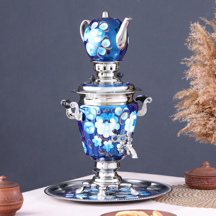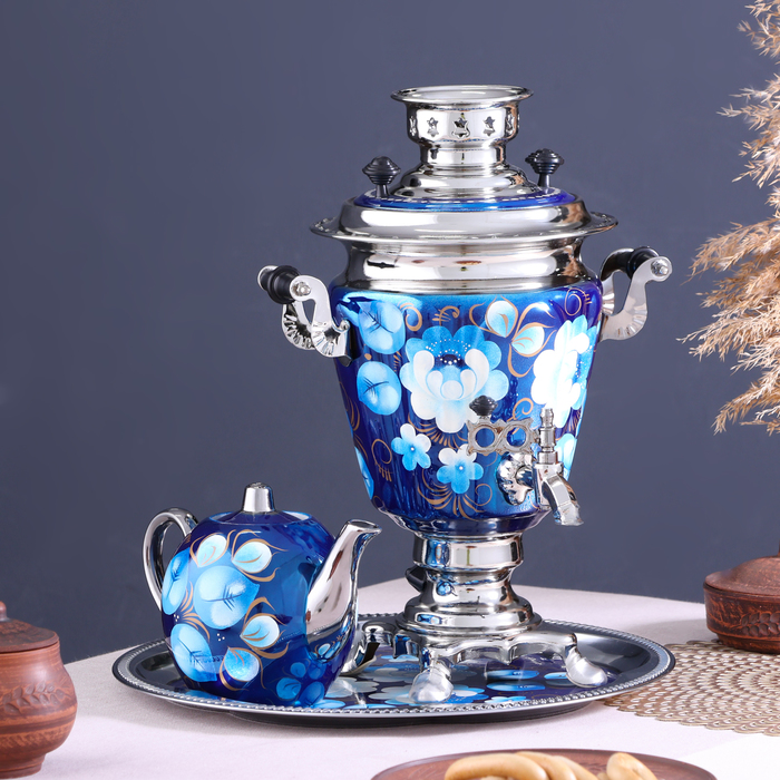 Набор посуды «Жостово на синем», 3 предмета: самовар 3 л, заварочный чайник 0.7 л, поднос 10 фото