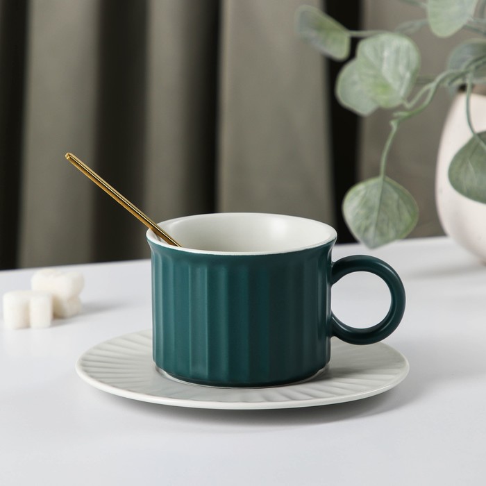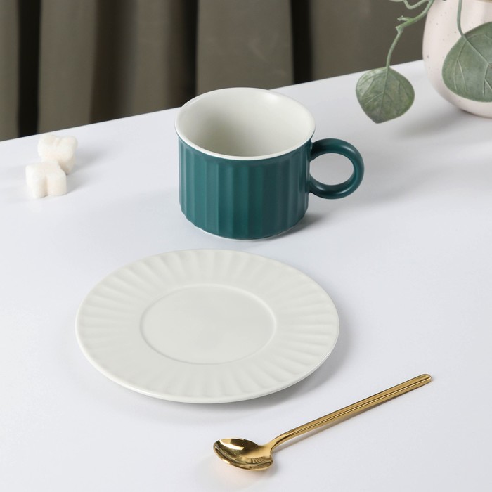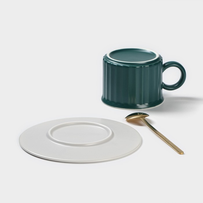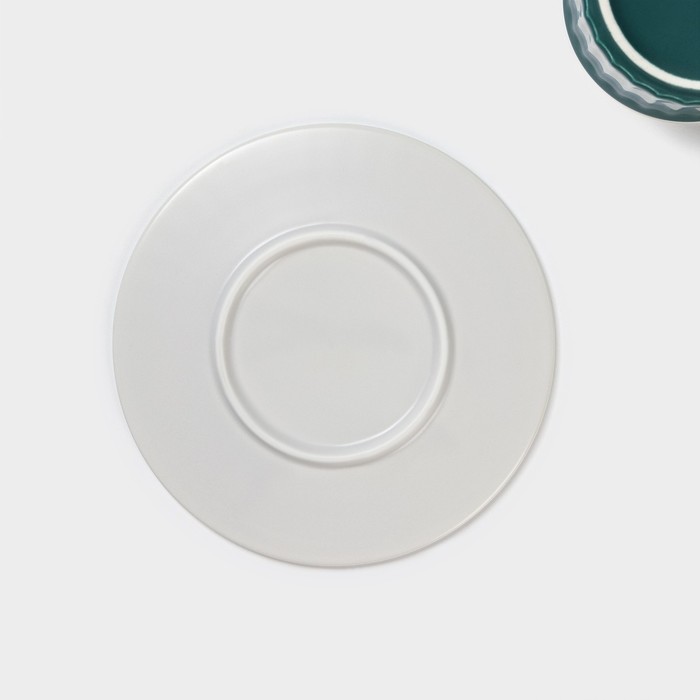 Чайная пара «Профитроль», 3 предмета: чашка 180 мл, блюдце d=13.7 см, ложка, керамика, зелёная, белая 7 фото