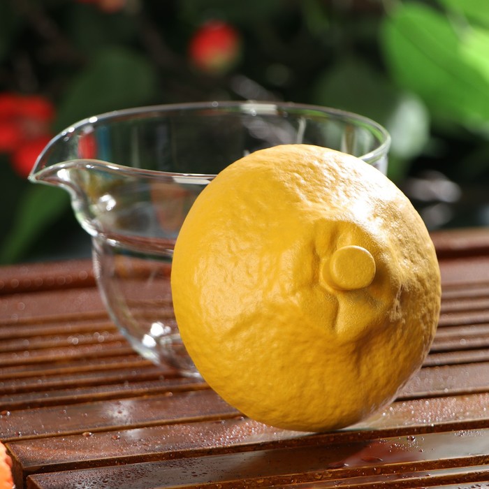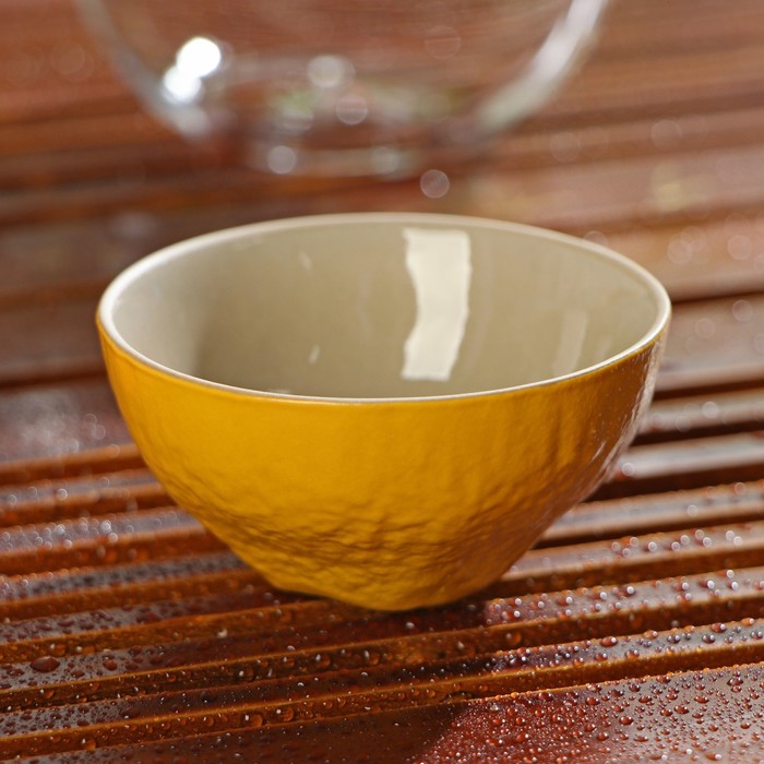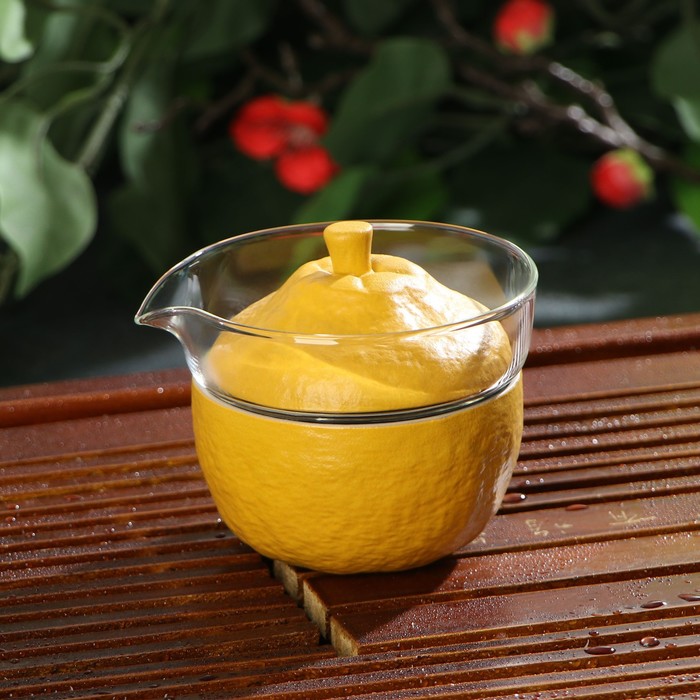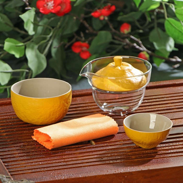 Набор для чайной церемонии «Лимон», 4 предмета: стеклянная чаша с крышкой 210 мл, 2 керамические чаши 40 мл и 150 мл, салфетка, сумка, жёлтый 5 фото