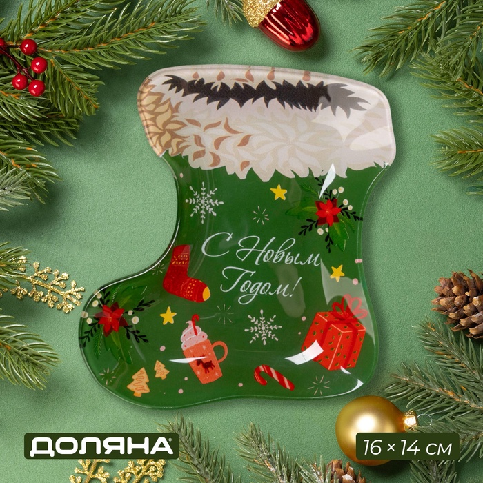 Блюдо стеклянное сервировочное Доляна «Сапожок. С Новым годом», 16×14 см, цвет зелёный 3 фото