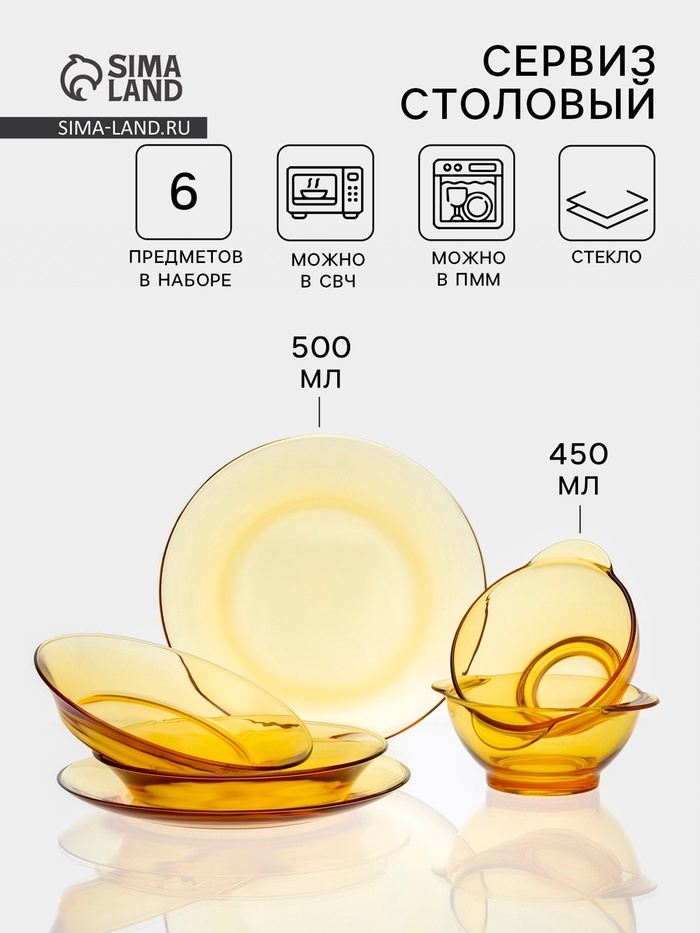 Сервиз столовый «Дымка», 6 предметов: 2 бульонницы 450 мл, 2 тарелки 500 мл, 2 тарелки d=23 см, жёлтый 9 фото