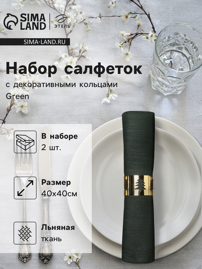 Набор сервировочных салфеток с декоративными кольцами Этель Green 40×40 см - 2 шт., 100% лён 10 фото