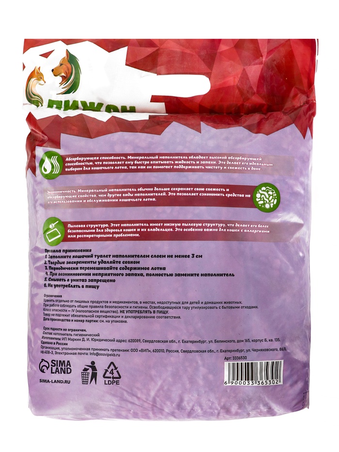 Наполнитель минеральный впитывающий «Пижон» для длинношерстных кошек, 5 л 7 фото