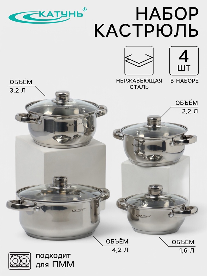 Набор кастрюль Катунь«Гретта», 4 предмета: 1.6 л, 2.2 л, 3.2 л, 4.2 л, капсульное дно, индукция, нержавеющая сталь, AISI - 201 10 фото