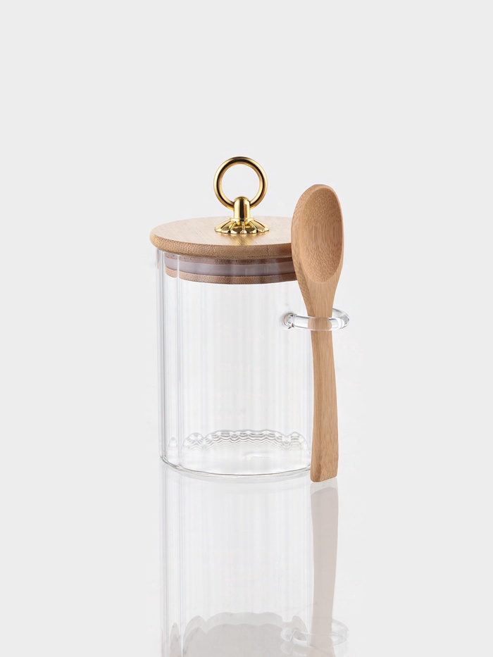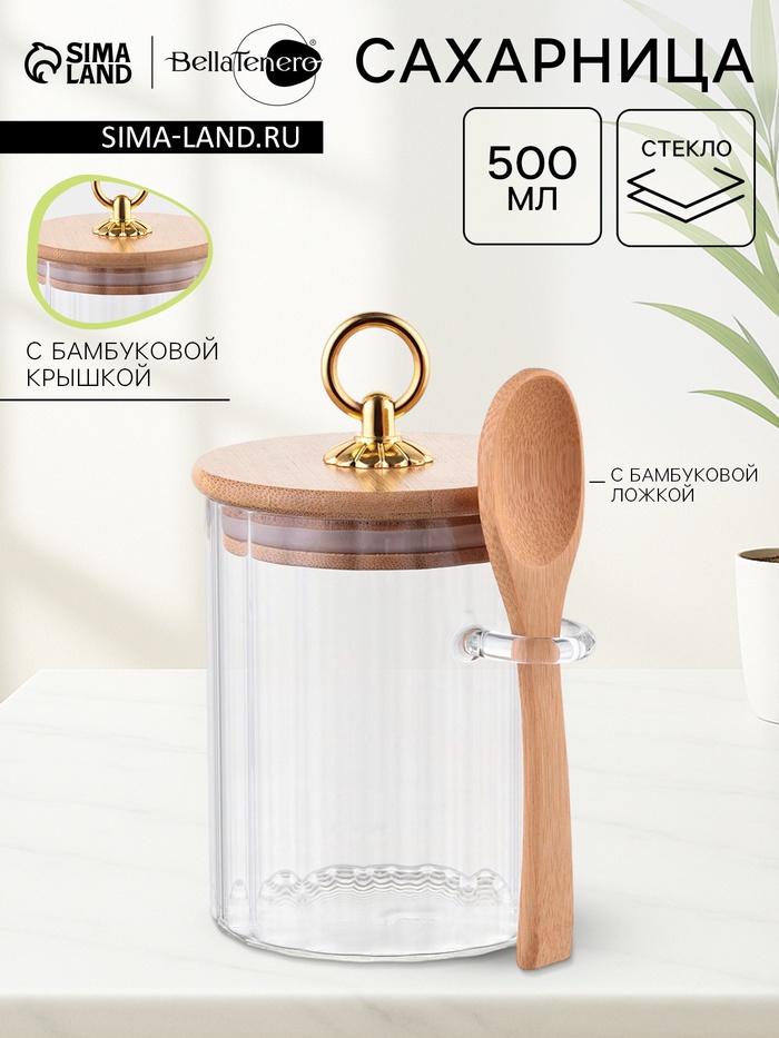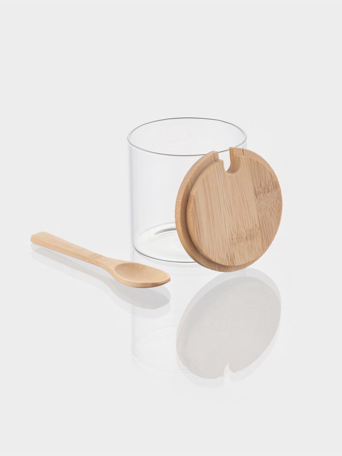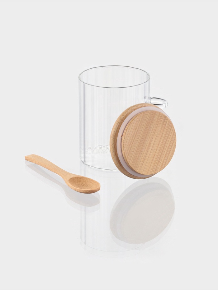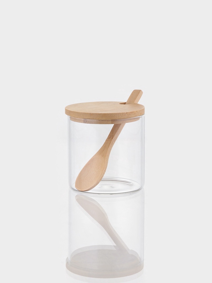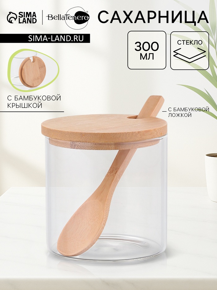 Сахарница Bella Tenero «Эко», 300 мл, 8×8×8.5 см, с бамбуковой крышкой и ложкой, стекло, прозрачная 8 фото