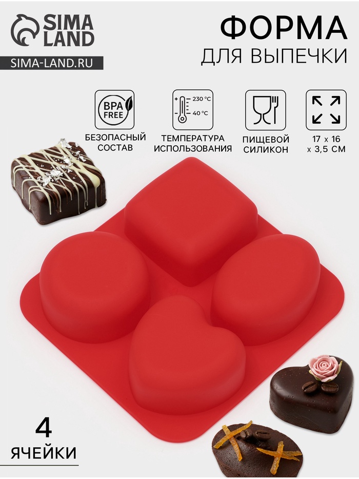 Форма для выпечки «Фигуры и сердце», 16×17 см, 4 ячейки (7×7 см), силикон, МИКС 8 фото