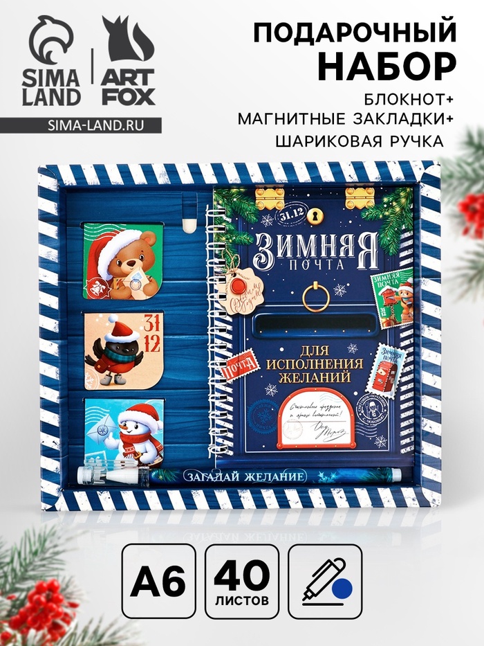 Подарочный набор новогодний, блокнот А6, 40 л., ручка пластик, магнитные закладки 3 шт. «Почта» 10 фото