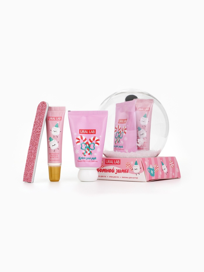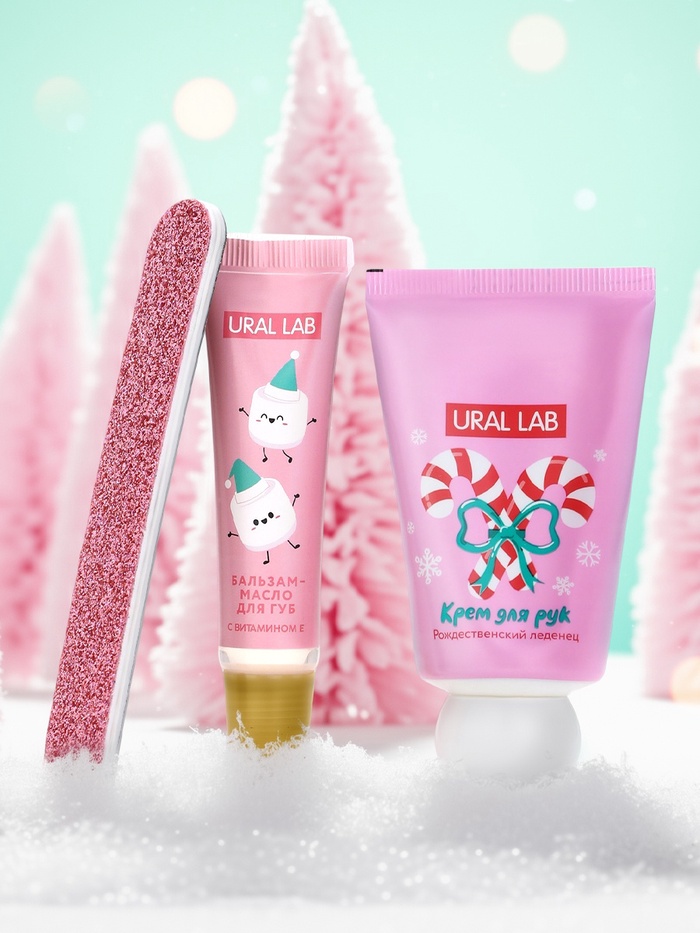 Новогодний подарочный набор косметики: крем для рук, бальзам для губ, пилочка для ногтей, URAL LAB 10 фото