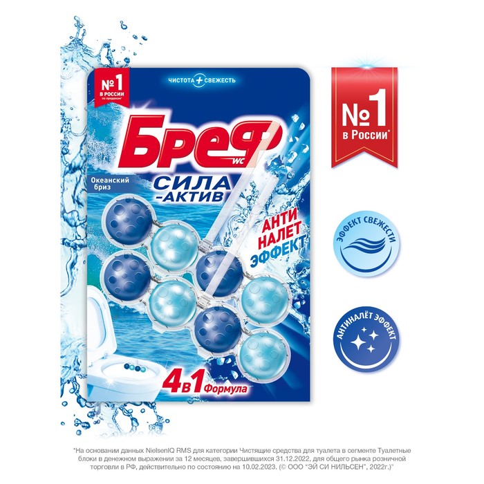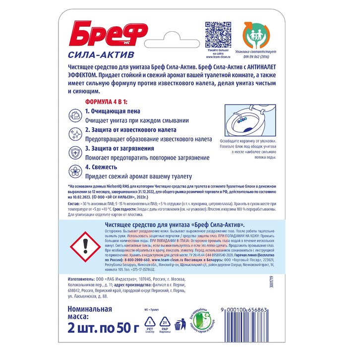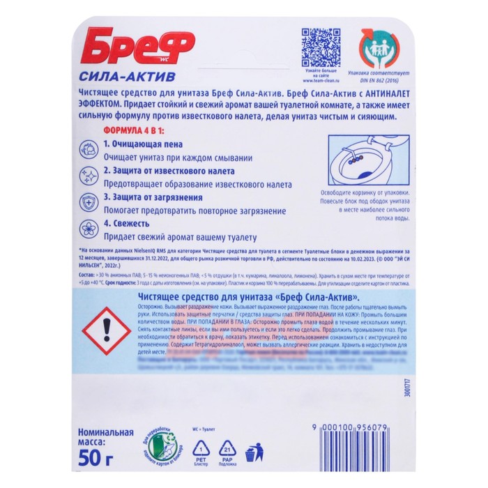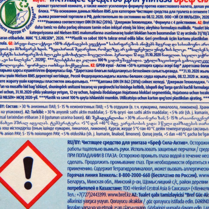 Блок для чистки и свежести унитаза Bref Сила актив 4 в 1, «Лимонная свежесть», 50 г 5 фото