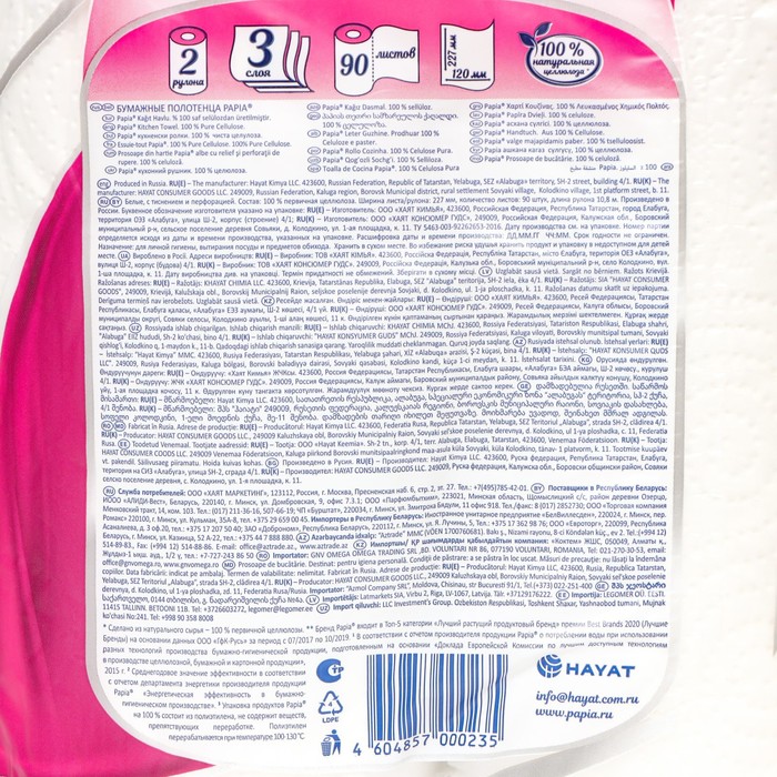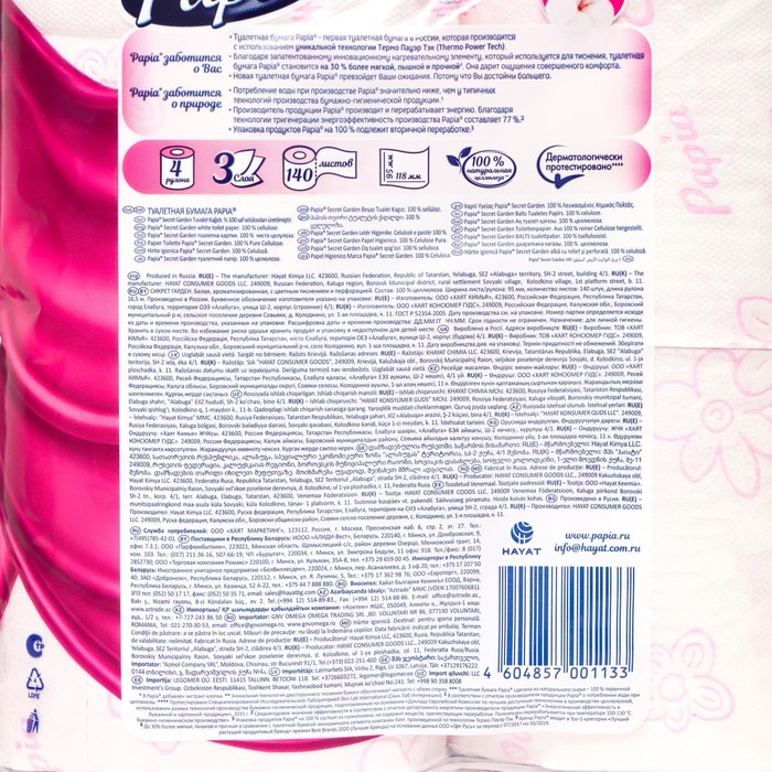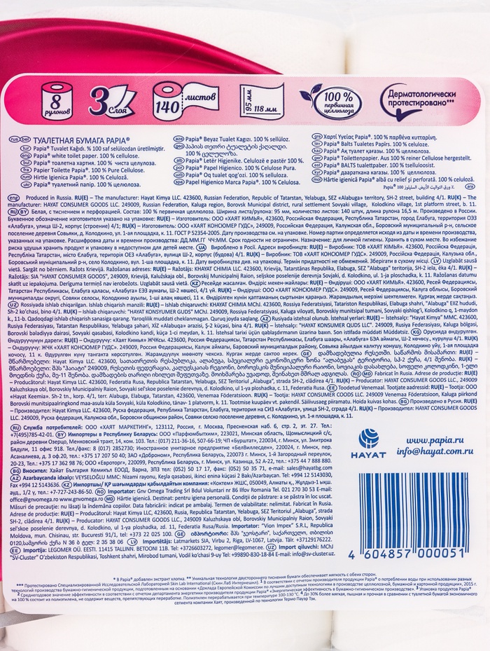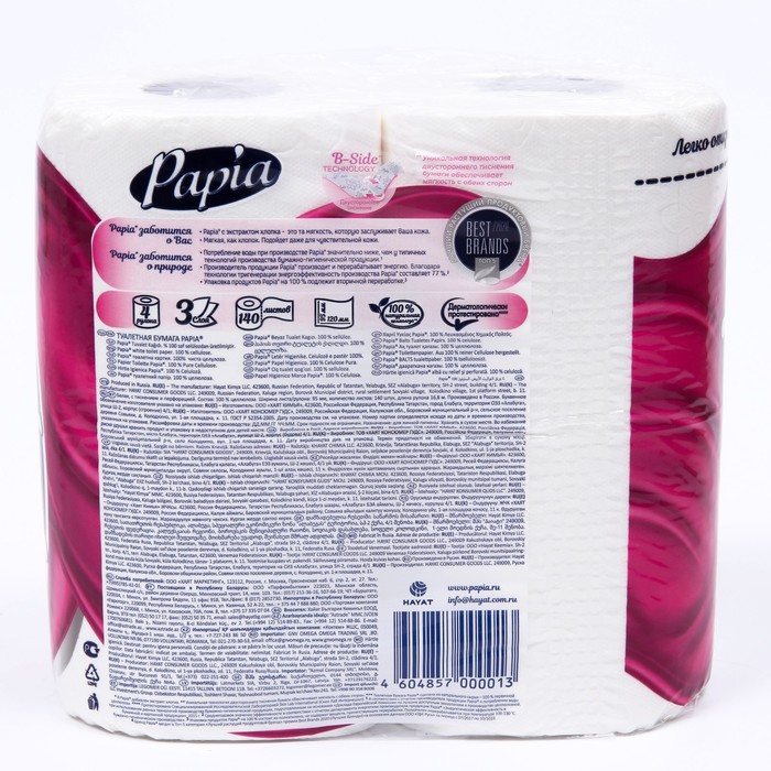 Туалетная бумага Papia, белая, 3 слоя, 4 рулона