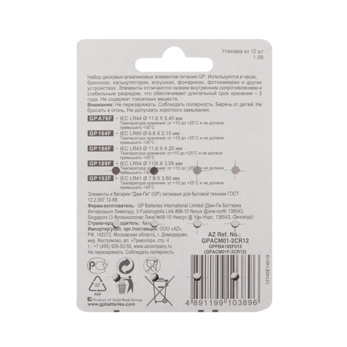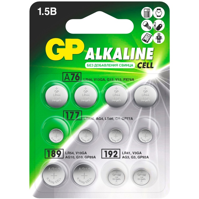 Батарейка алкалиновая GP, ACM01-12BL (А76 по 4 шт; 164. 186, 189, 192 по 2 шт.); 1.5 В, 12 шт.