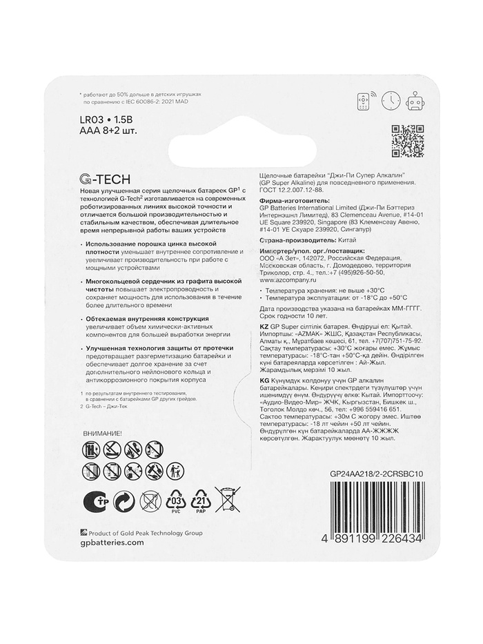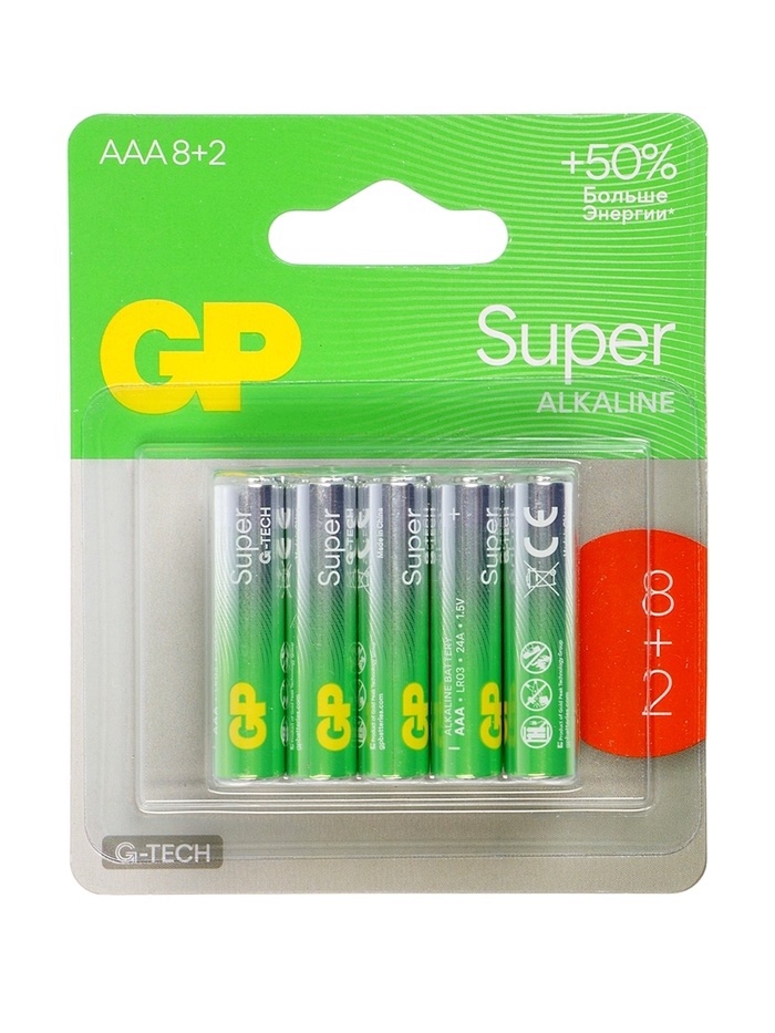 Батарейка алкалиновая GP Super, AAA, LR03-10BL, 1.5 В, 8+2 шт.