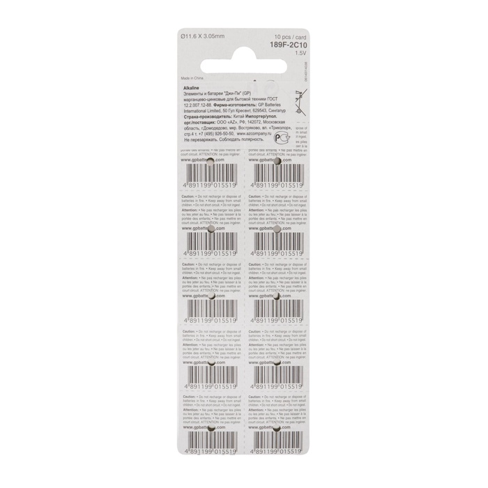 Батарейка алкалиновая GP, 189-10BL (Аналоги: LR54, G10, V10GA, LR1130, 189), 1.5 В, 10 шт.