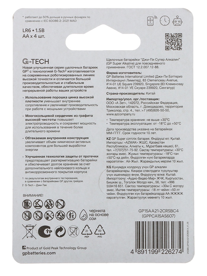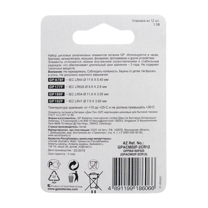 Батарейка алкалиновая GP, ACM02F-12BL (А76 по 4 шт; 164.186.189 192 по 2 шт.); 1.5 В, 12 шт.