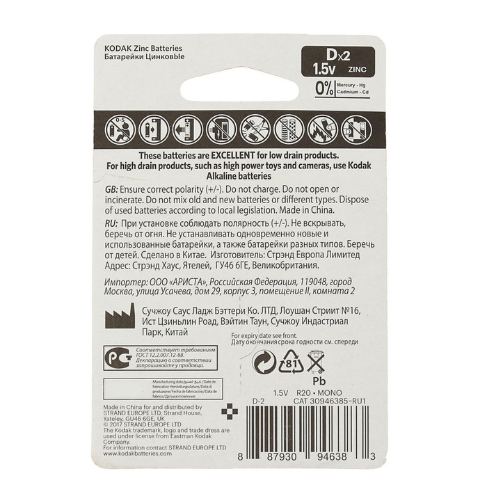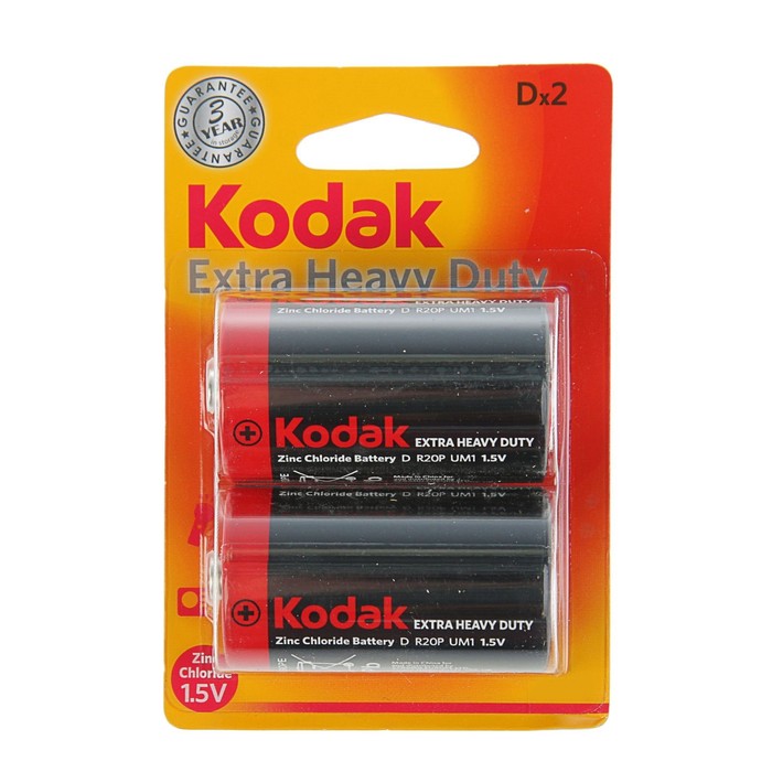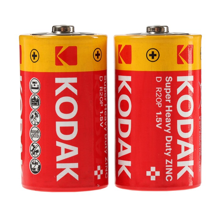Батарейка солевая Kodak Super Heavy Duty, D, R20-2BL, 1.5 В, блистер, 2 шт.