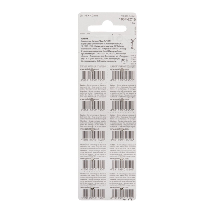 Батарейка алкалиновая GP, 186-10BL (Аналоги: LR43, G12, V12GA, 186), 1.5 В, блистер, 10 шт.