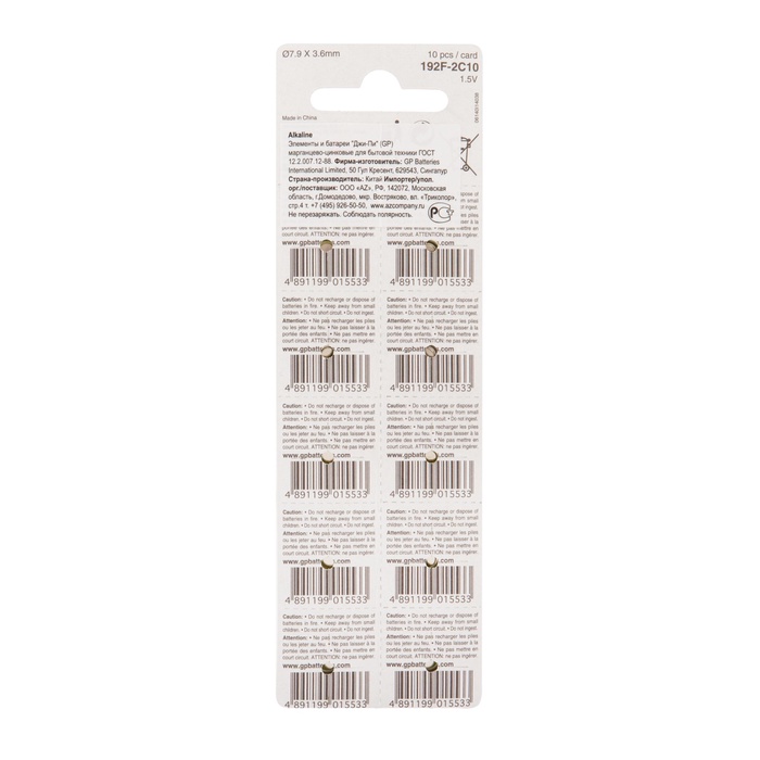 Батарейка алкалиновая GP, 192-10BL (Аналоги: LR4, G3, V3GA, LR41.192), 1.5 В, блистер, 10 шт.