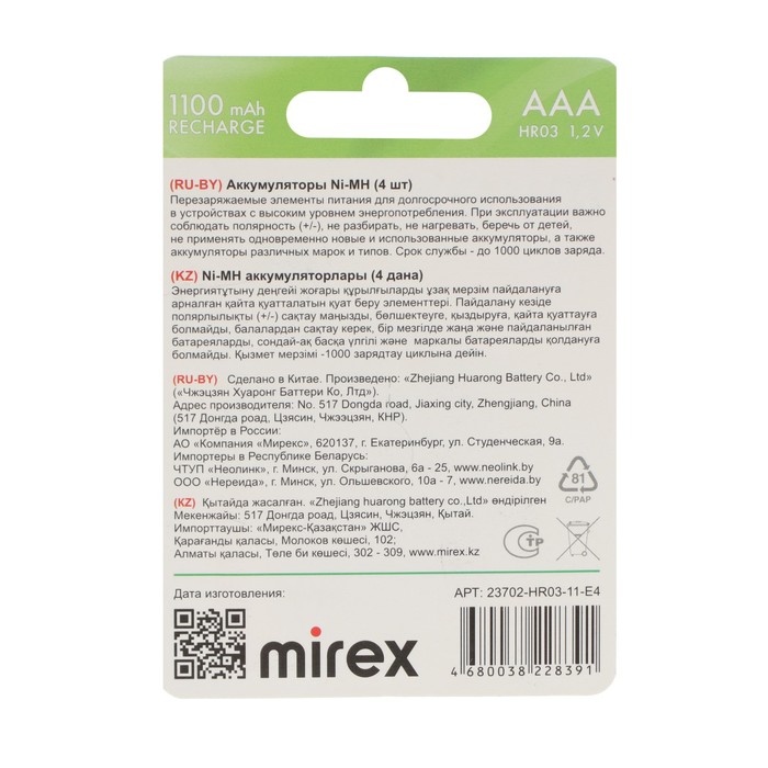 Аккумулятор Mirex, Ni-Mh, AAA, HR03-4BL, 1.2 В, 800 мАч, блистер, 4 шт. 4 фото
