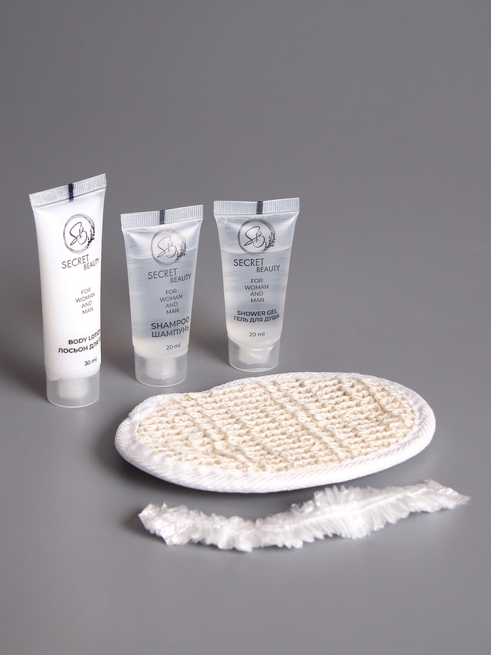 Дорожный набор (шампунь, гель для душа, шапочка, лосьон и мочалка)