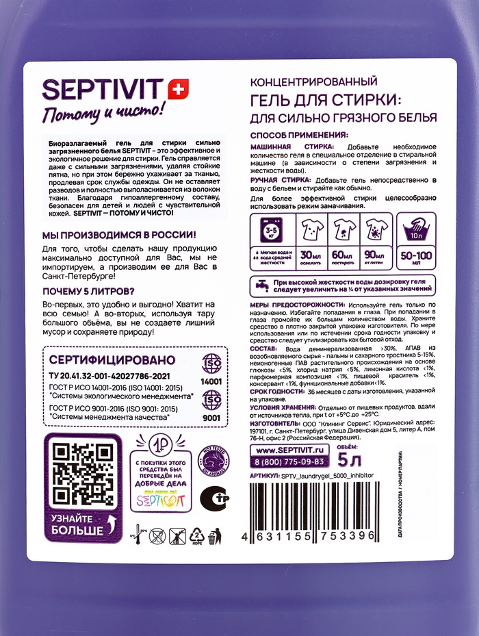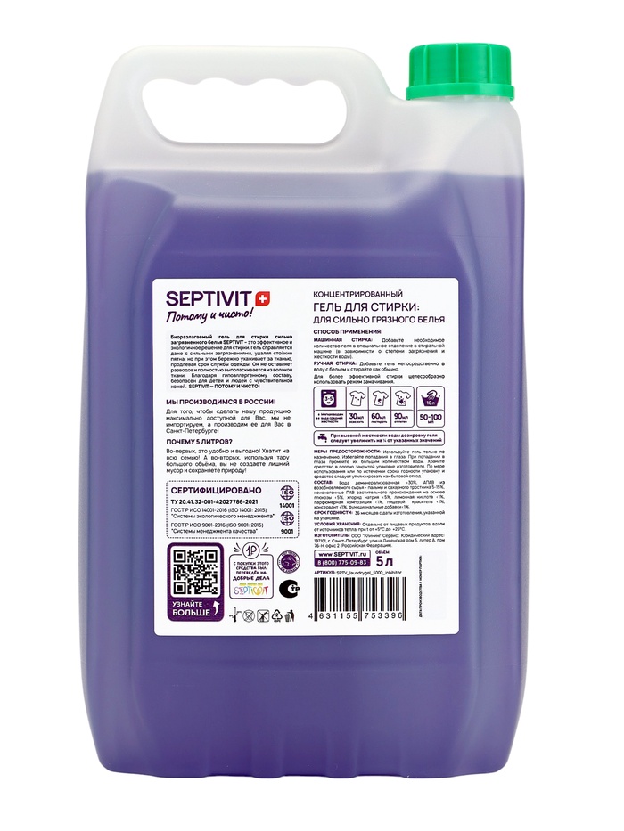 Гель для стирки SEPTIVIT «Сильнозагрязненные вещи», 5 л