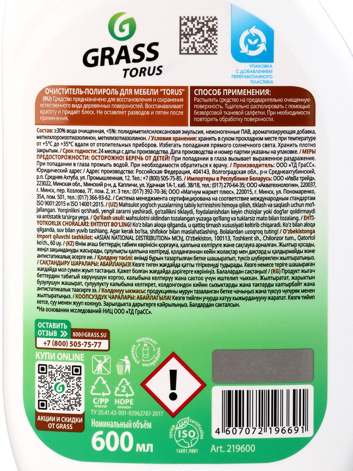 Очиститель-полироль для мебели Grass Torus, 600 мл 3 фото