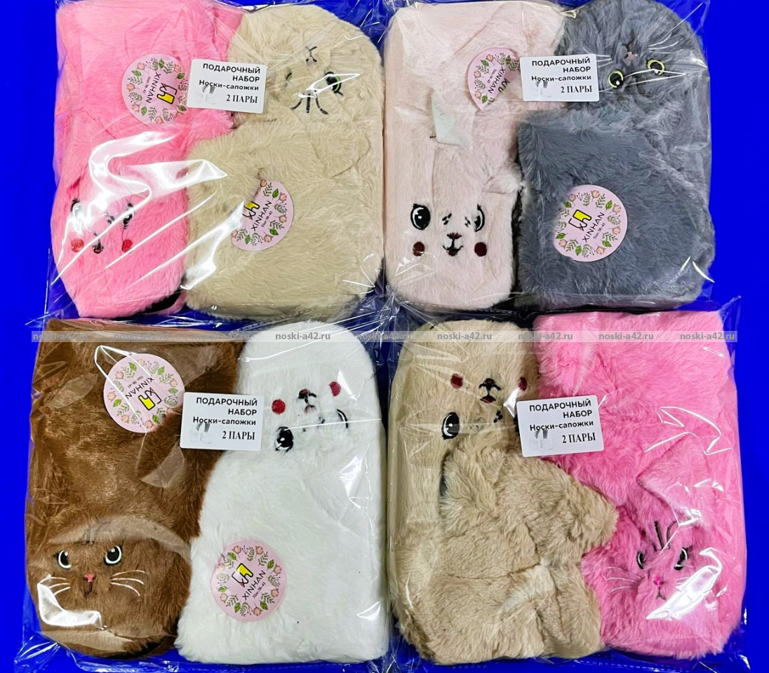 2 ПАРЫ - Подарочный набор носки-САПОЖКИ женские с мехом Мордочки ВЫСОКИЕ
