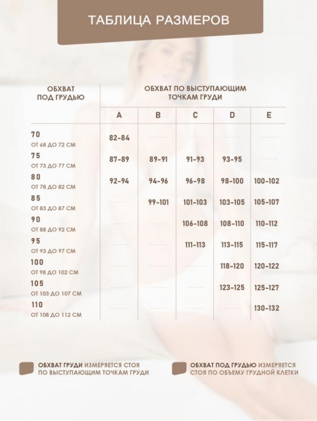 Размер : 75С, 75D, 80, 80Е, 80C, 80D, 85D, 85F, 85E, 90E, 90D, 90F, 95E, 100E, 95D, 90C, 100F, 110F, 85C, 105F, 95F