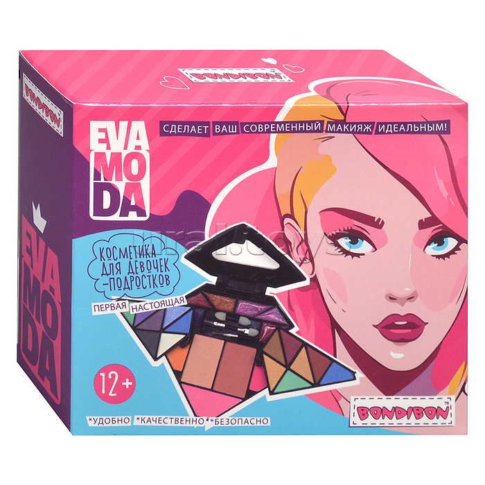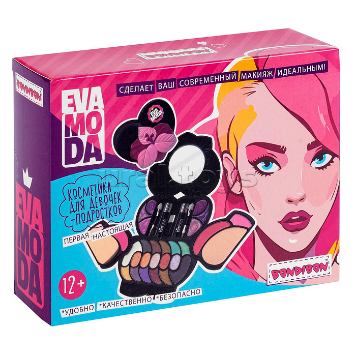 Набор детской декор. косметики Bondibon Eva Moda, BOX 16,5х12,5х4,5 см; тени для век-17шт.(12,48г), блеск для губ-6шт.(4г), румяна-4шт.(5,28г), пудра-1шт.(3,68г), тушь-2шт.(3,2г), аппликатор-3шт., пуховка-1шт., зеркало-1шт.,