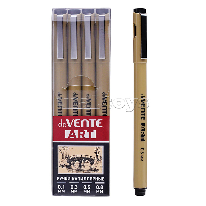 Набор ручек капиллярных "ART" 04 шт, d=0,1, 0,3, 0,5, 0,8 мм, чернила - черные перманентные, круглый корпус, металлический клип, пишущий узел в металлической обойме, в пластиковой коробке