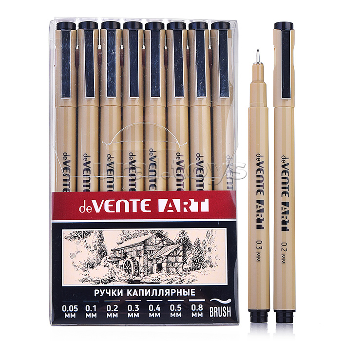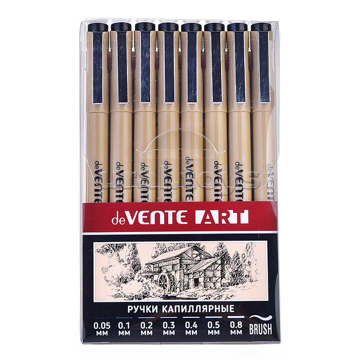 Набор ручек капиллярных "ART" 08 шт, d=0,05, 0,1, 0,2, 0,3, 0,4, 0,5, 0,8 мм и кистевидный, чернила - черные перманентные, круглый корпус, металлический клип, пишущий узел в металлической обойме (кроме кистевидного), в пластиковой коробке