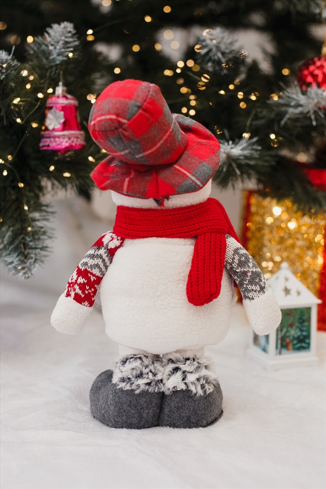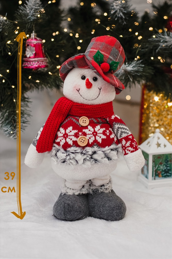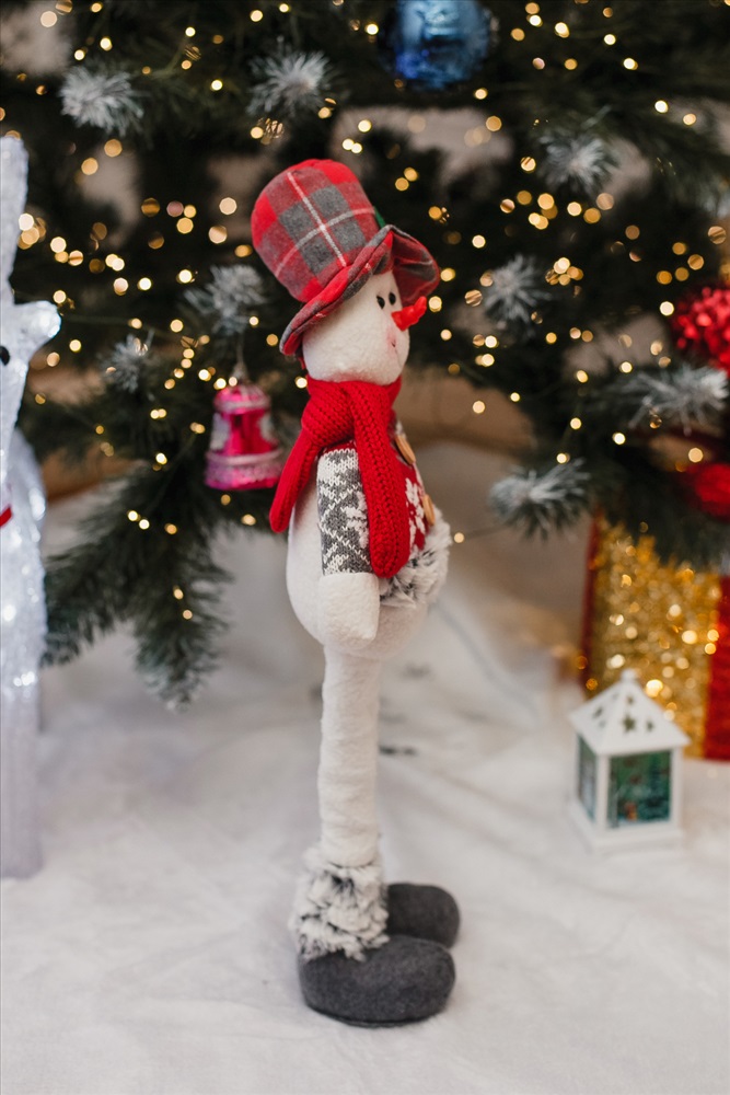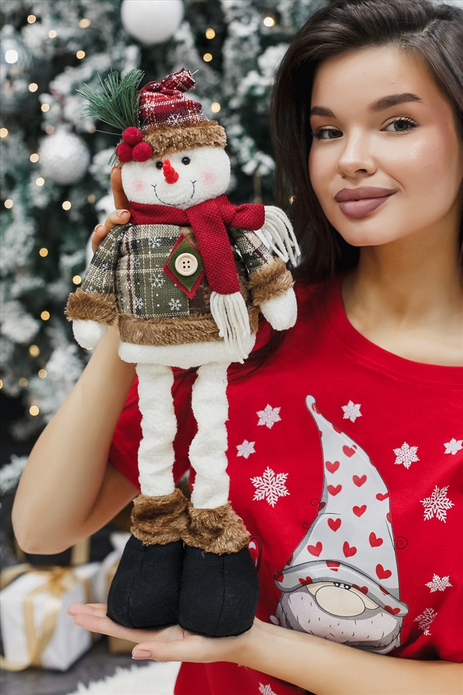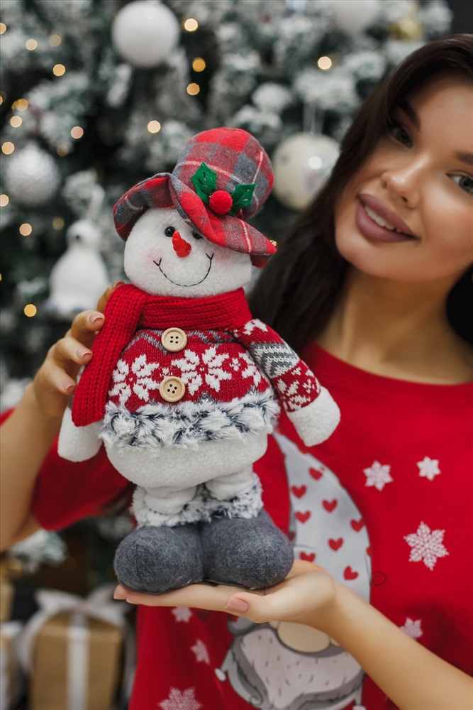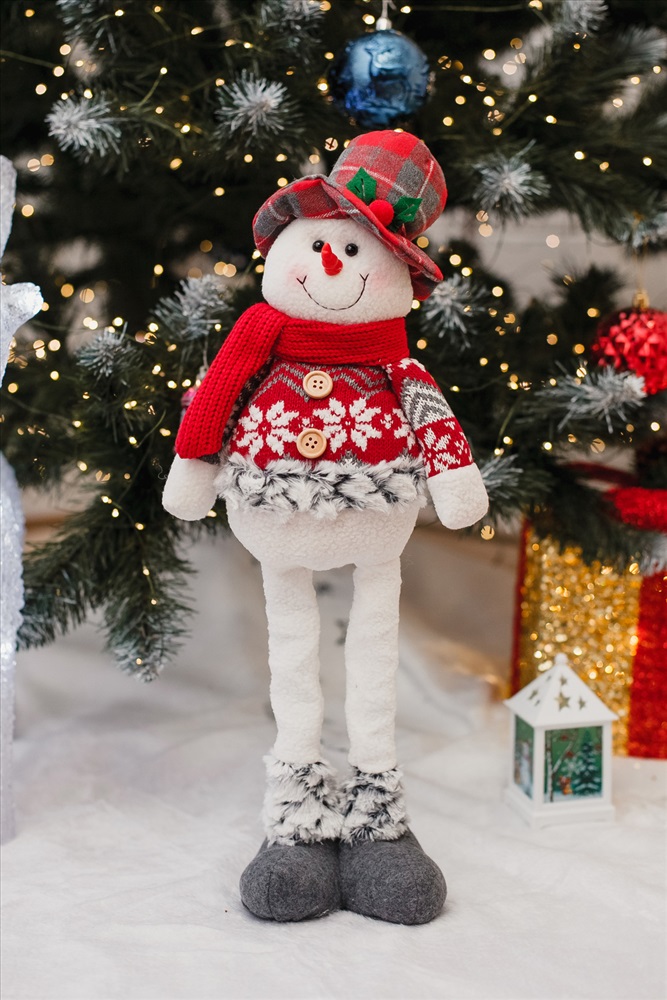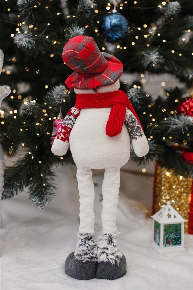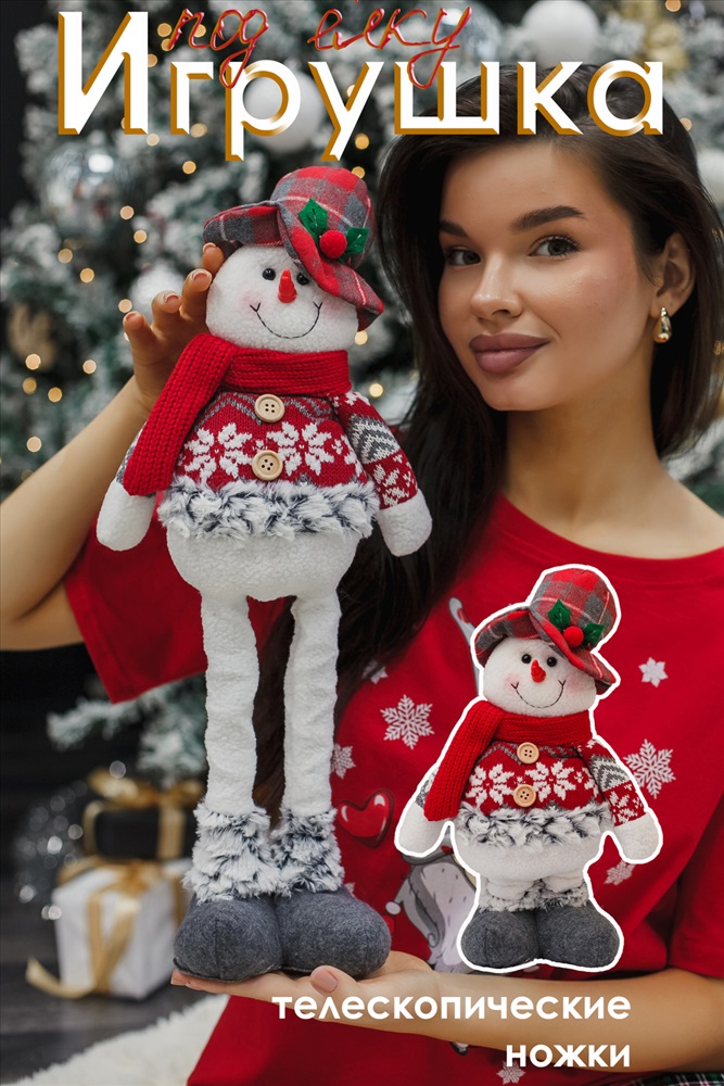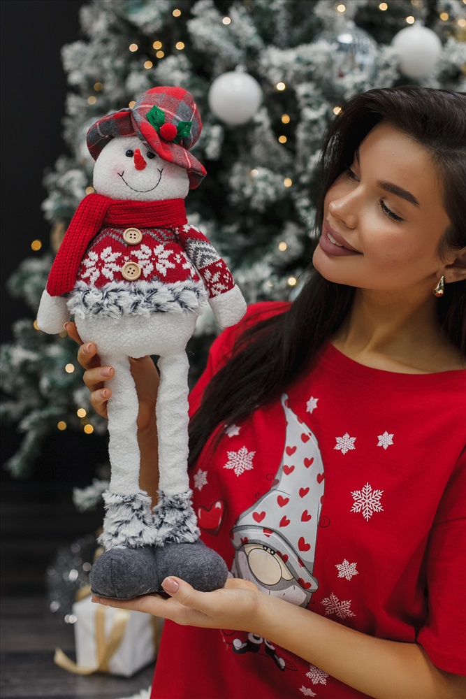 Игрушка новогодняя с выдвижными ногами Снеговик в шляпе с ягодой серо-красный 8 фото