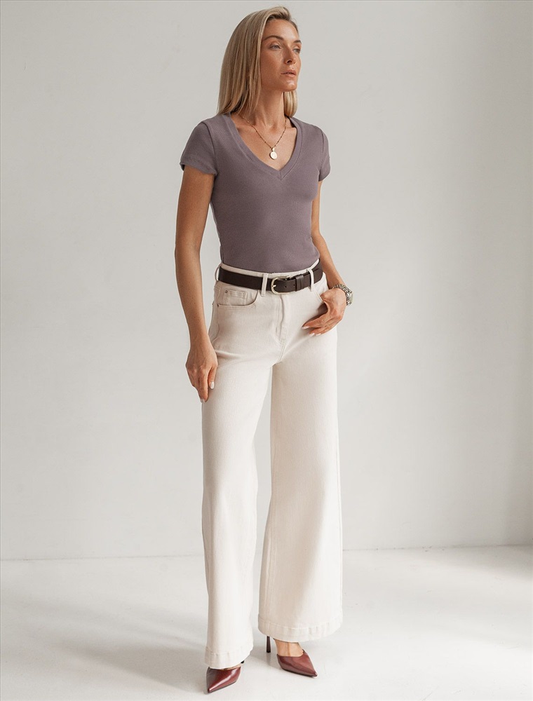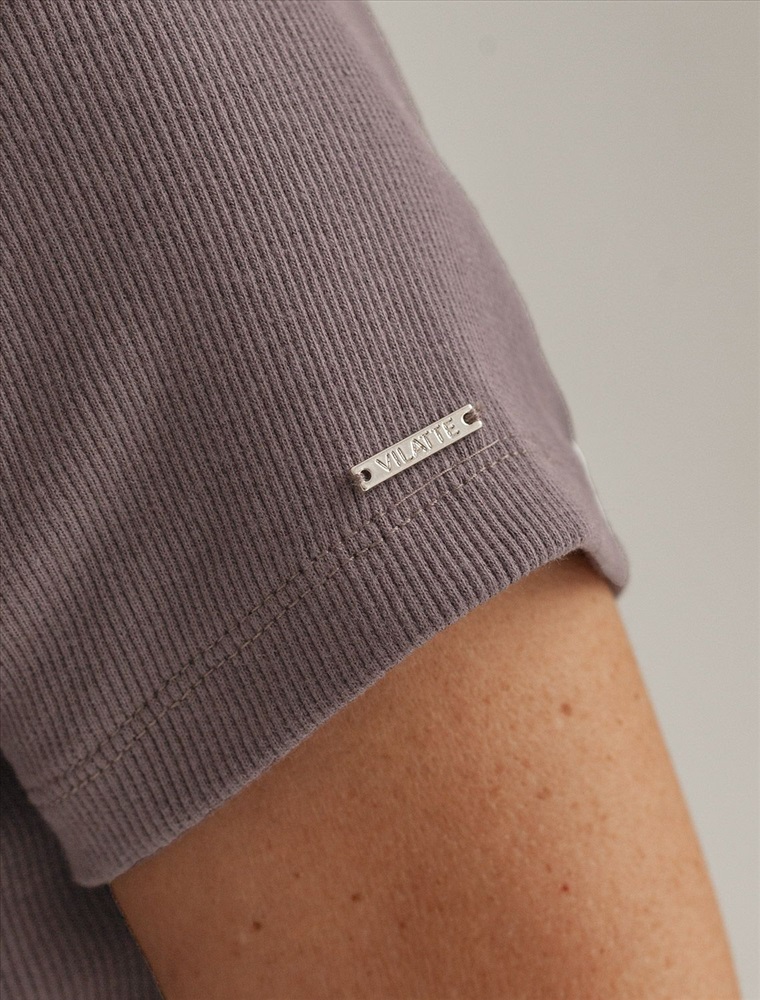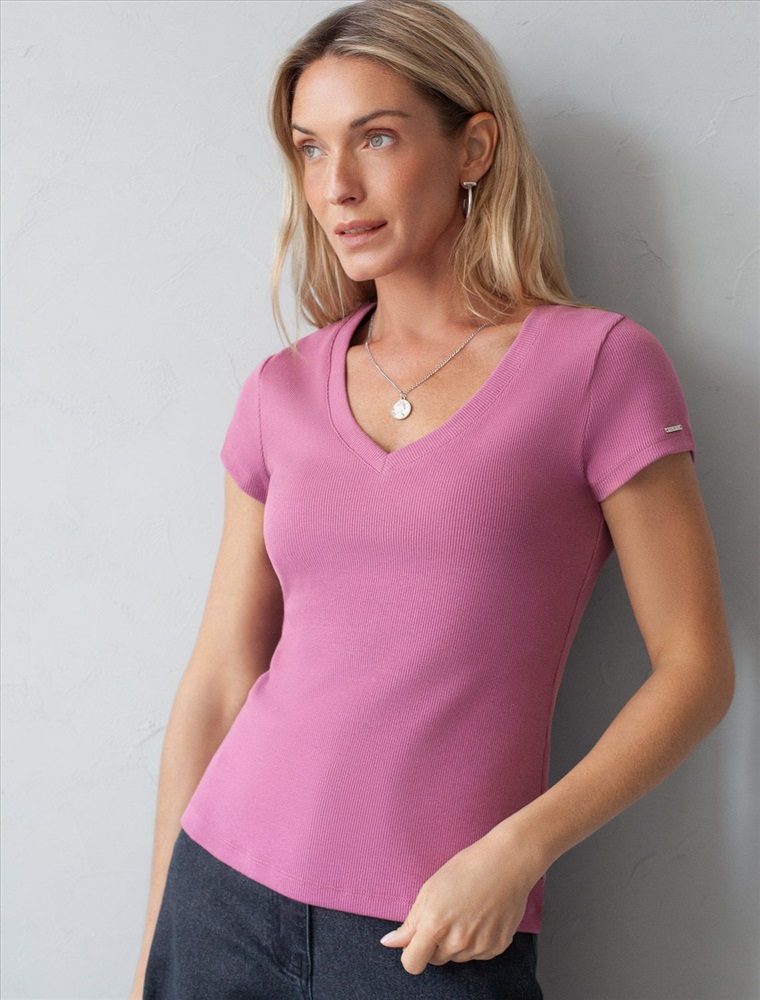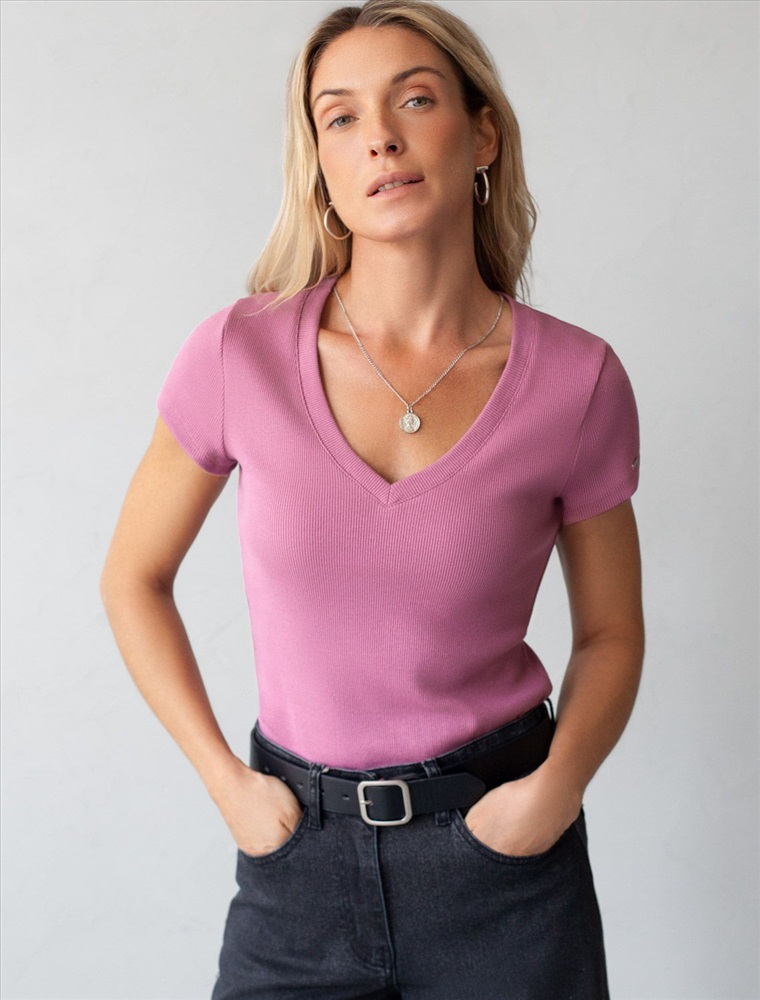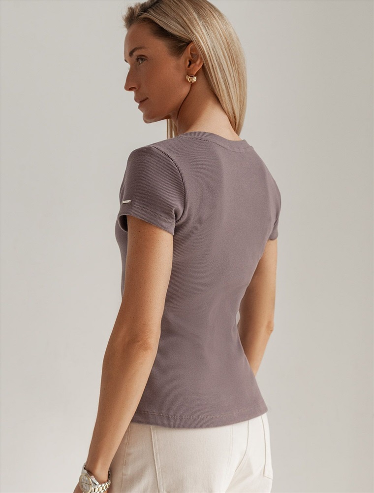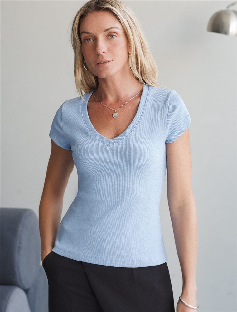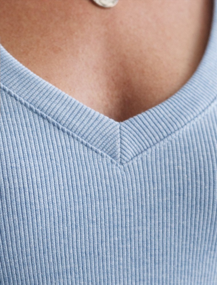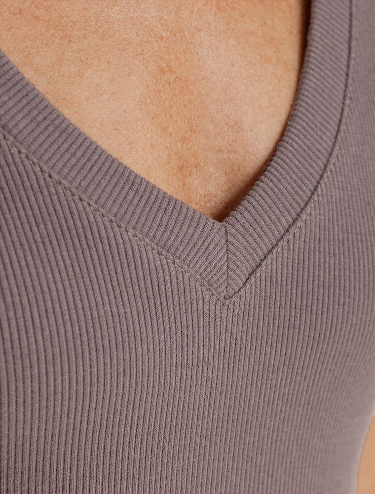 Футболка из плотного трикотажа в рубчик с V-образным вырезом 8 фото