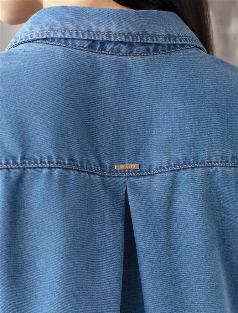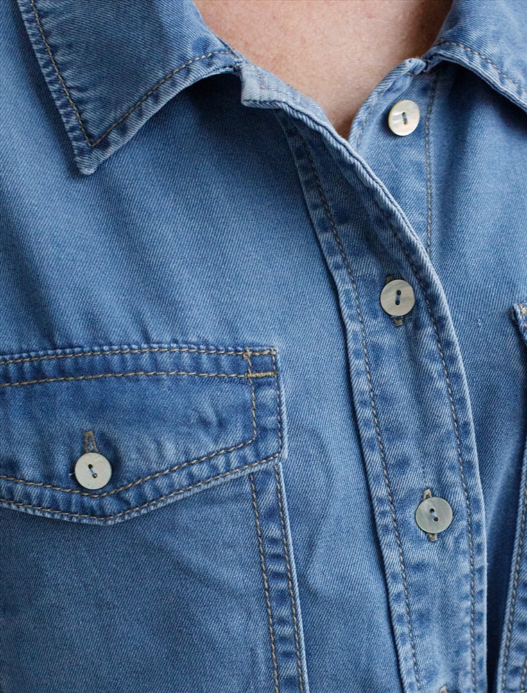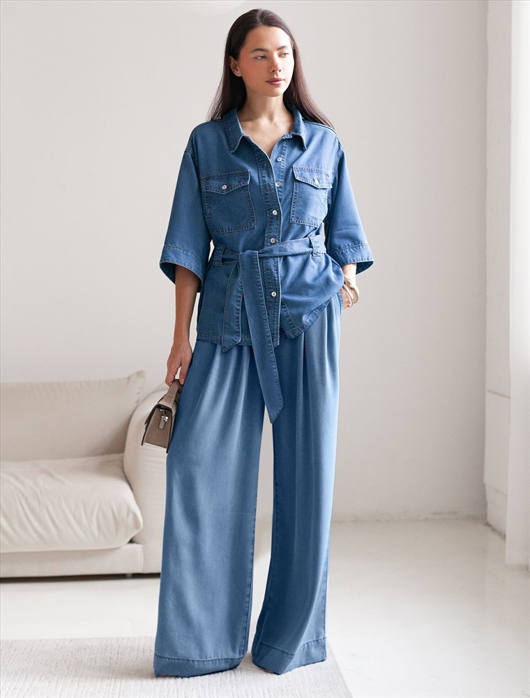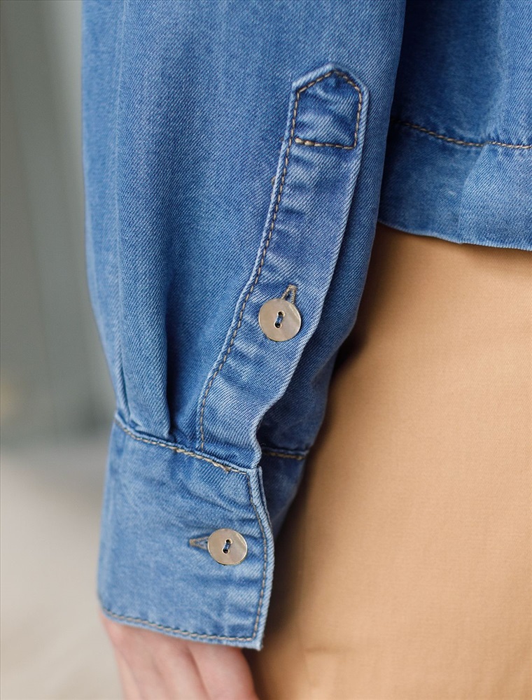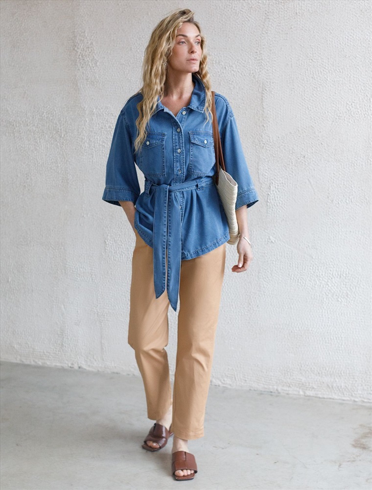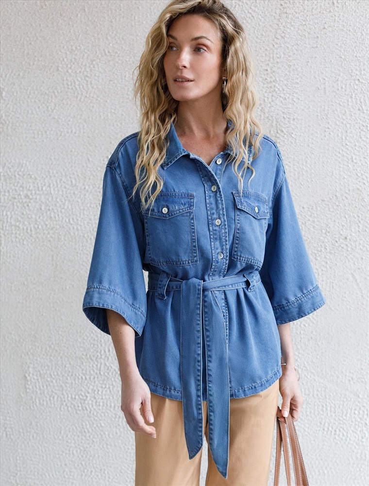 Удлиненная блузка с поясом и карманами из джинсового лиоцелла 9 фото